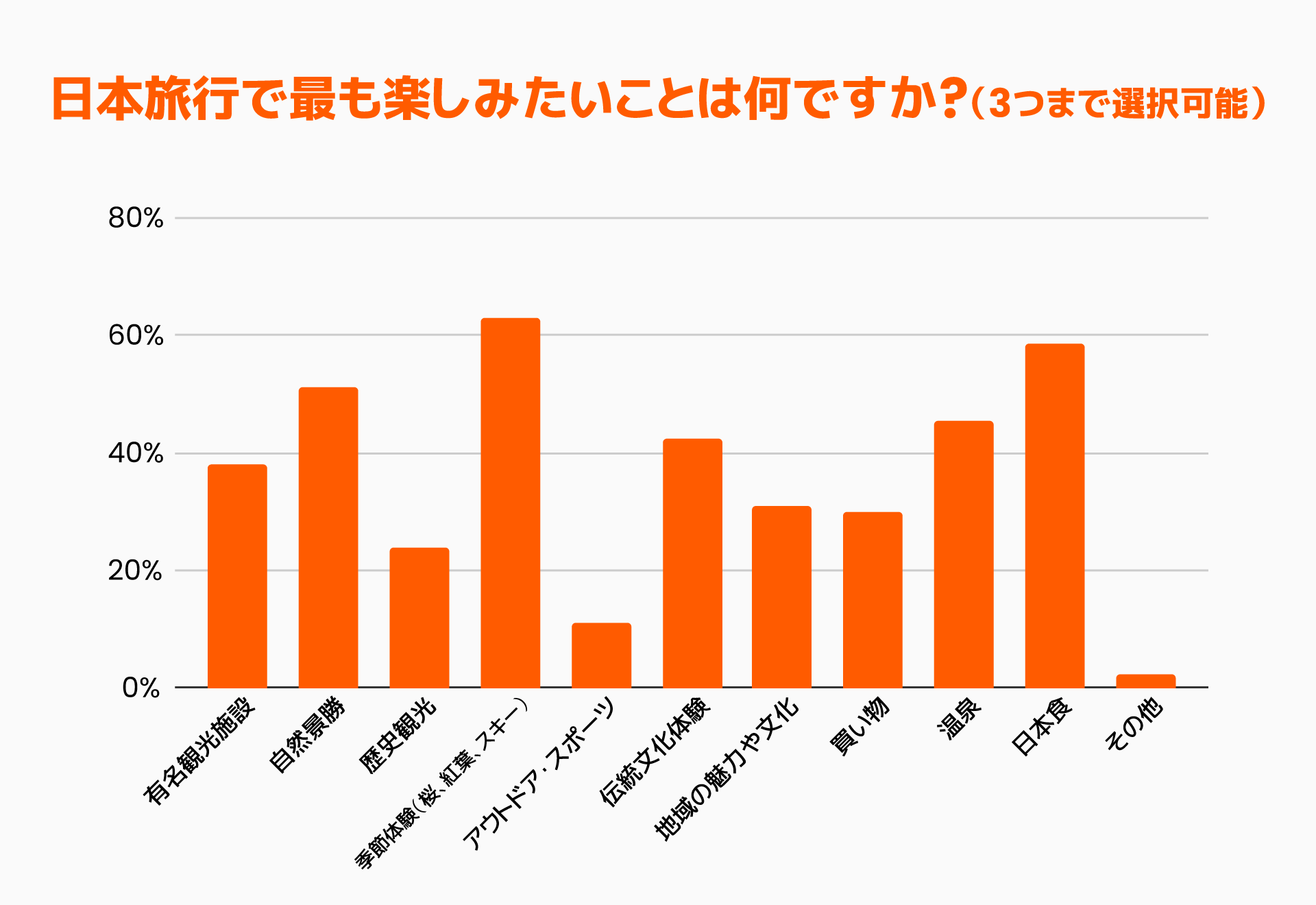 「日本旅行で最も楽しみたいことは何ですか?(3つまで選択可能)」という質問をしたところ(n=508)、1位は「季節体験(桜、紅葉、スキー等)」(63.%)、2位「日本食」(58.7%)、3位「自然景勝」(51.2%)、4位「温泉」(45.5%)、5位「伝統文化体験」(42.5%)となりました。