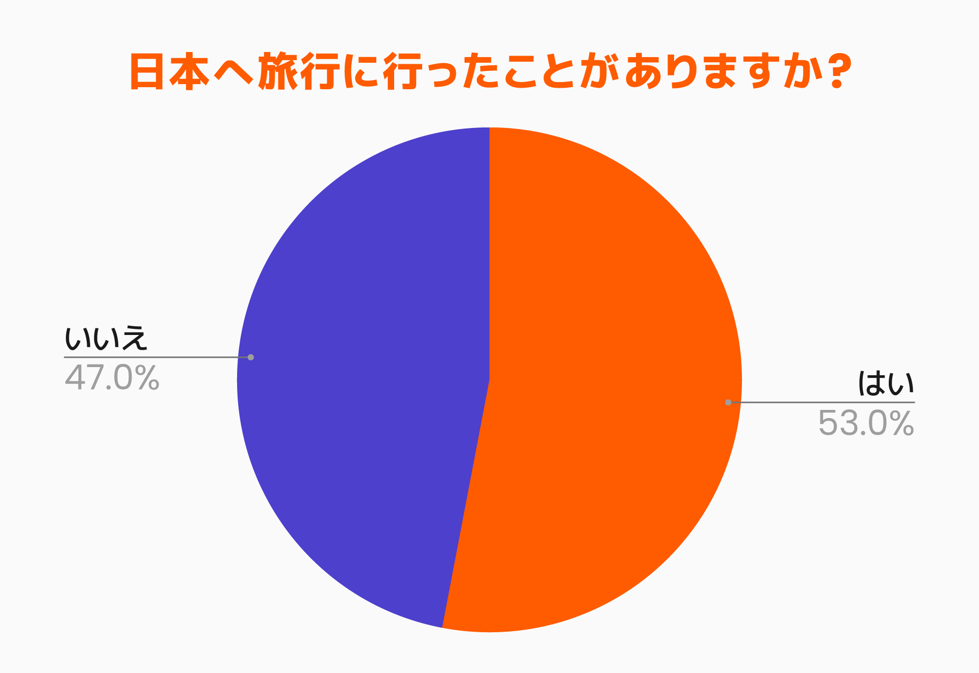 「日本へ旅行に行ったことがありますか?」(n=628)との質問に、「はい」は53.0%、「いいえ」は47.0%という結果となり、日本への旅行経験の有無はほぼ半々となりました。
