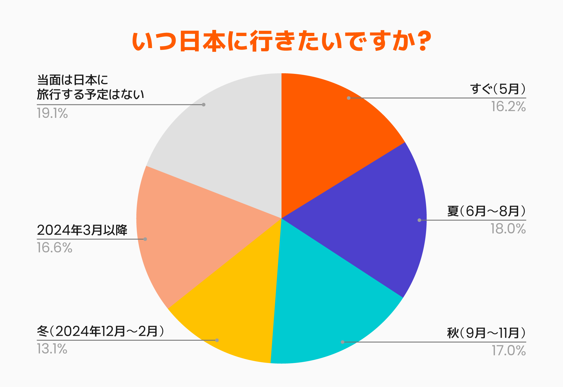 「いつ日本に行きたいですか?」との質問(n-628)に対し、「すぐ(5月)」という回答が16.2%、「この夏(6月〜8月)」が18.0%、「この冬(2024年12月〜2月)」が13.1%、「2024年3月以降」が16.6%、「当面は日本に旅行する予定はない」が19.1%となり、合わせて6割以上がこの冬までに日本へ旅行に行きたいという結果になりました。