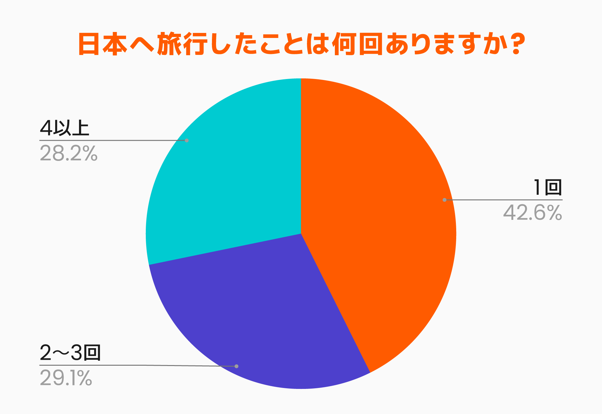 「日本へ旅行したことは何回ありますか」との問い(n=333)に対し、「1回」と回答した人は42.6%、「2〜3回」は29.1%、「4回以上」は28.2%と、6割近くが2回以上日本へ旅行したことのある訪日リピーターでした。