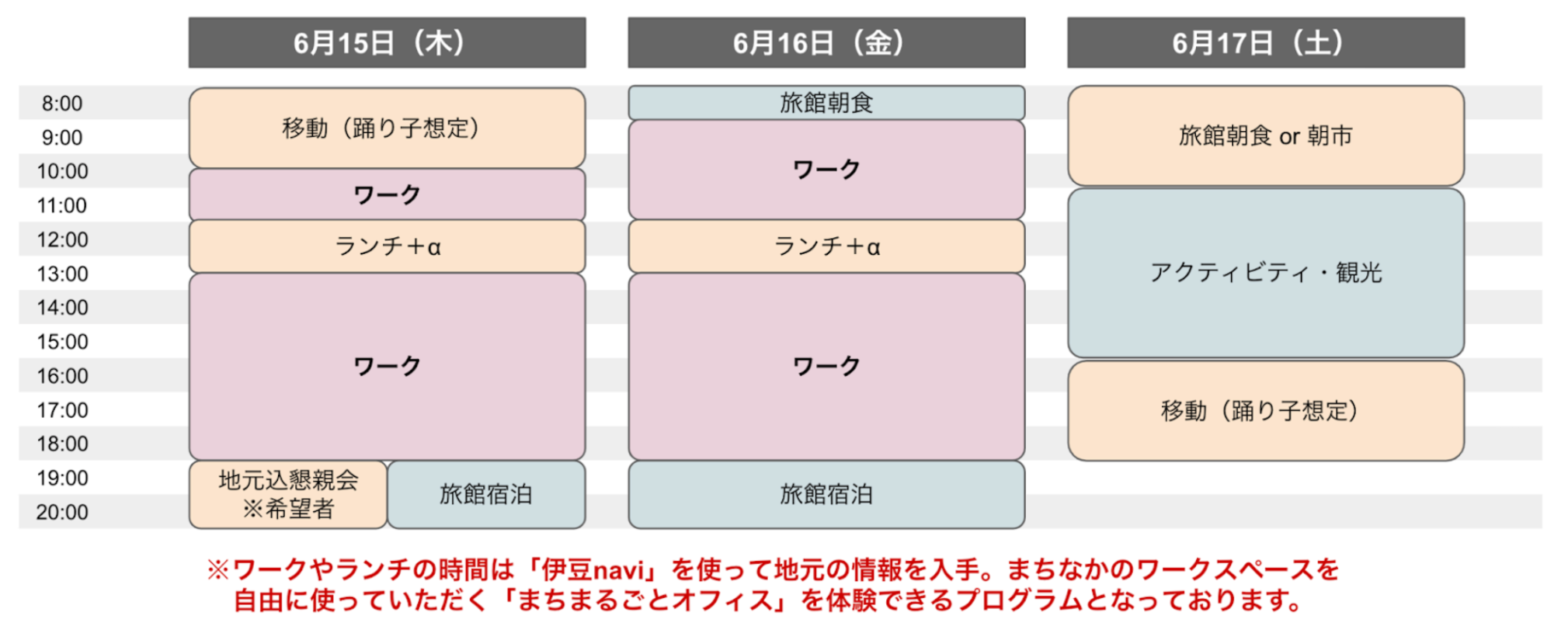 ・東伊豆町内で、指定日時の1泊2日もしくは2泊3日のワーケーションを実施して頂くこと(観光目的での参加は不可)。