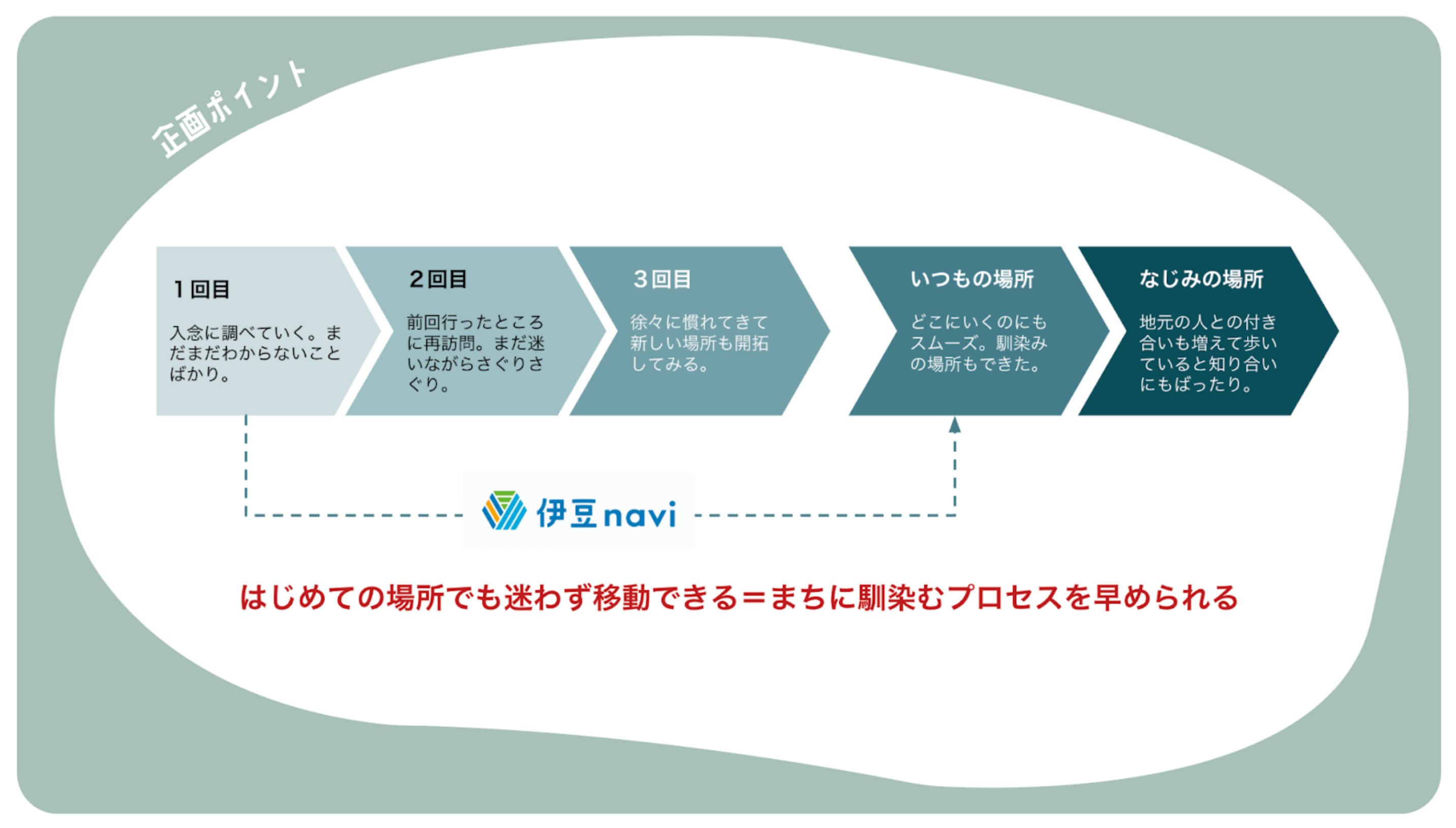 今回、この「まちまるごとオフィス東伊豆」を展開するNPO法人ローカルデザインネットワークをローカルパートナーに選定し、東伊豆に拠点を置く株式会社micro developmentが「伊豆navi」と連携した”まちに馴染む”ワーケーション企画を開催します。「伊豆navi」を使うことで、地元の観光飲食情報や、カーシェアやレンタサイクル等の交通手段の情報が入手できるため、はじめての土地での目的地探しやそこまでの移動がスムーズになります。また、これまで何度も訪れないと知ることができなかった情報をデジタルサービスを通じて容易に入手できるようになることで、まちにより馴染みやすく、愛着をもってもらえるスピードを高める効果があると考えています。