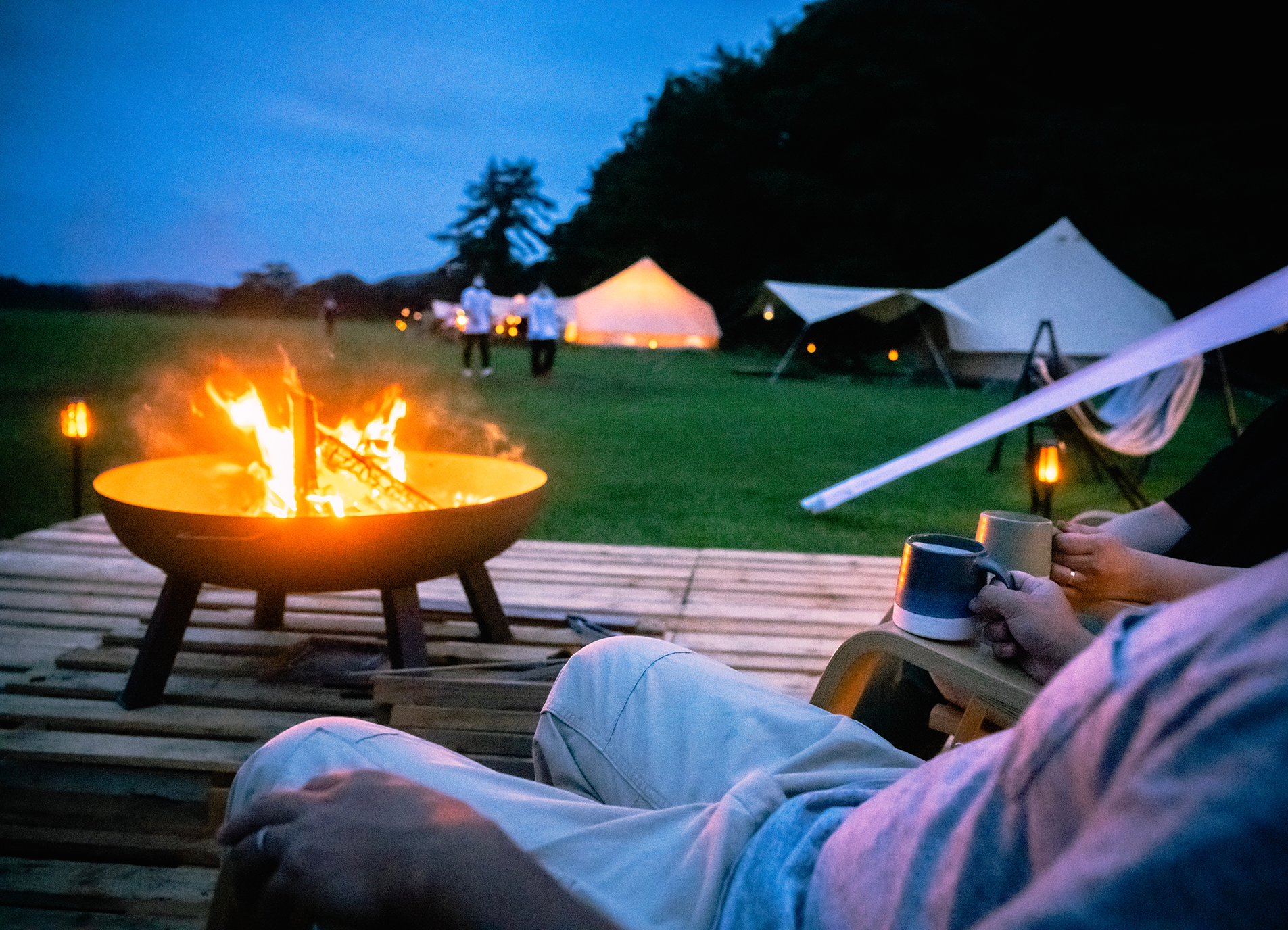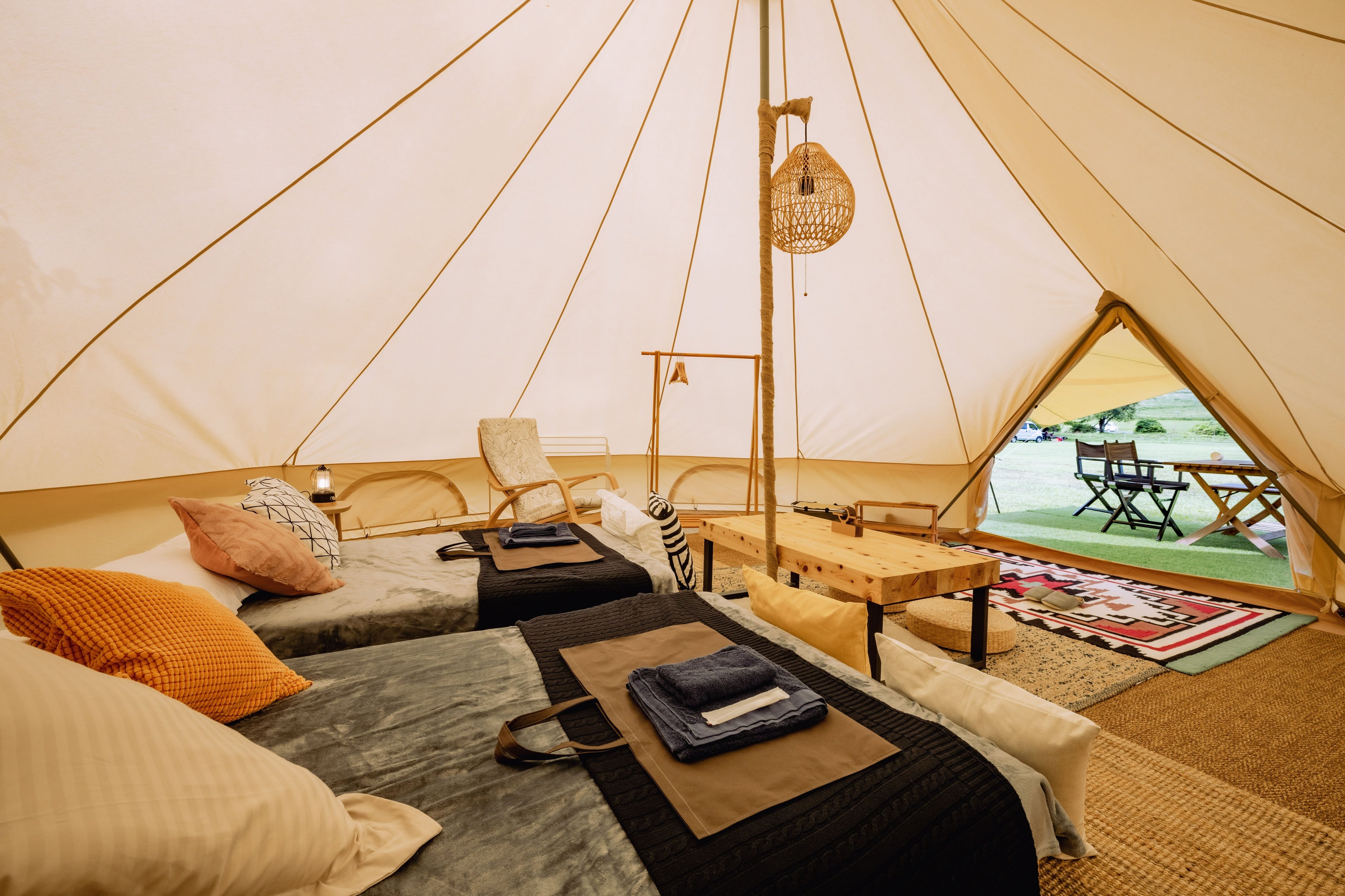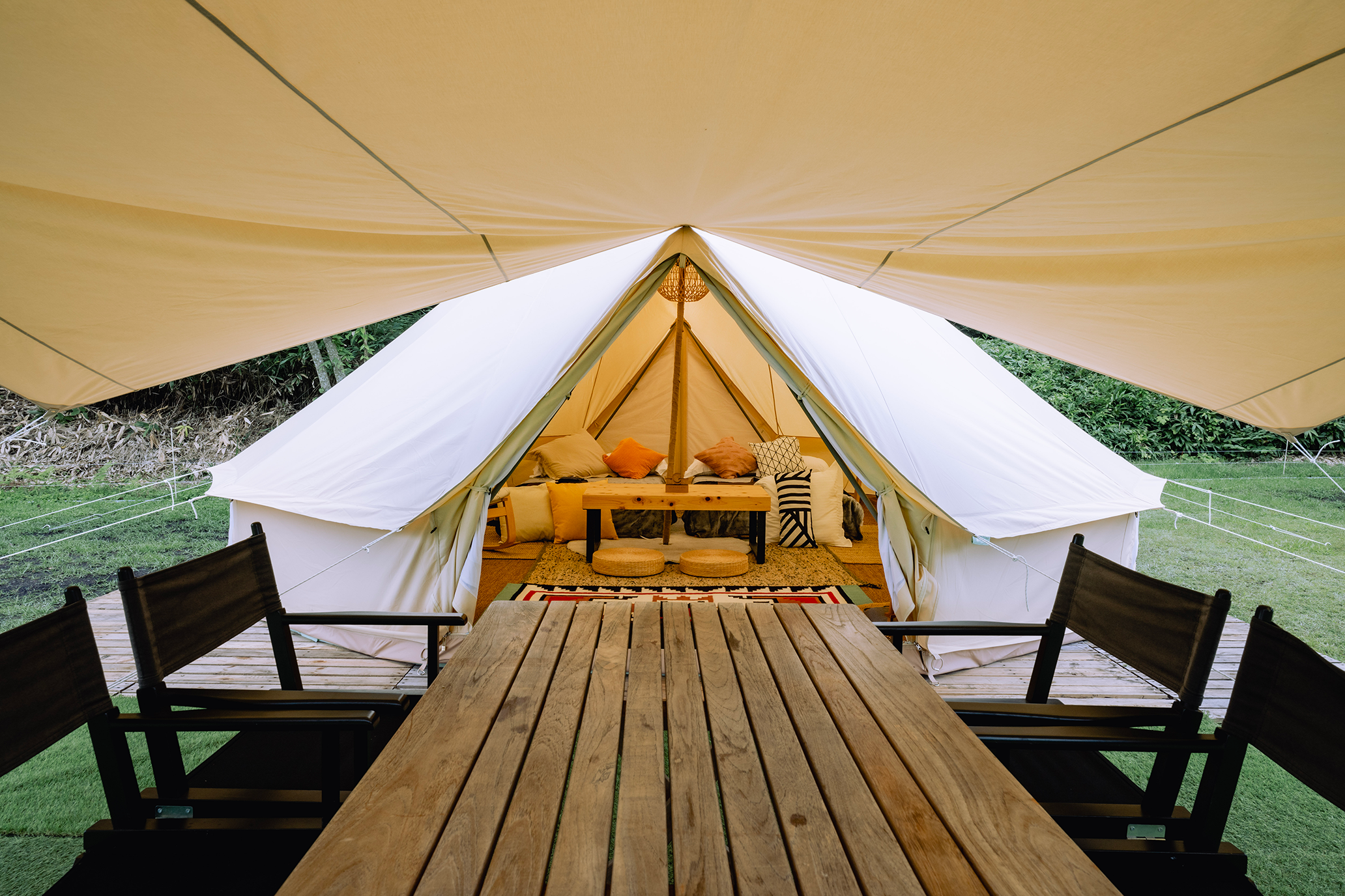三瓶山西の原は、およそ5万年前の噴火でできたカルデラの中に広がる草原。そのような歴史ある大自然に抱かれながら滞在できるテントスペースはシンプルな内装ながらも高級感を感じていただけるインテリアとしました。ご宿泊の皆様が集い、リラックスして景色や焚き火を楽しんでいただけるラウンジスペースも設置しています。