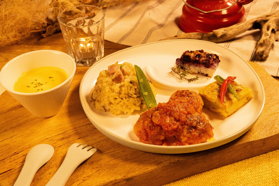 宿泊は1泊2食付きで、たくさんの地元食材を使った食事メニューは山の駅さんべがプロデュース。作り立てを閉じ込めたパウチで提供するため、アウトドアの醍醐味である作る楽しさは活かしながらも面倒な調理はせず本格的な食事を楽しんでいただくことができます。昨年の期間限定営業時にご要望の多かったキッズメニューについても新たにラインアップいたしました。