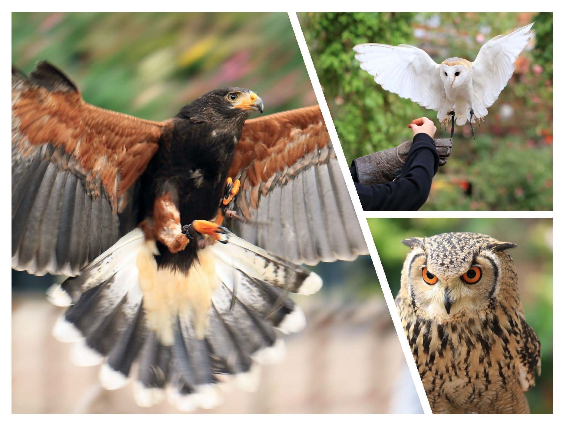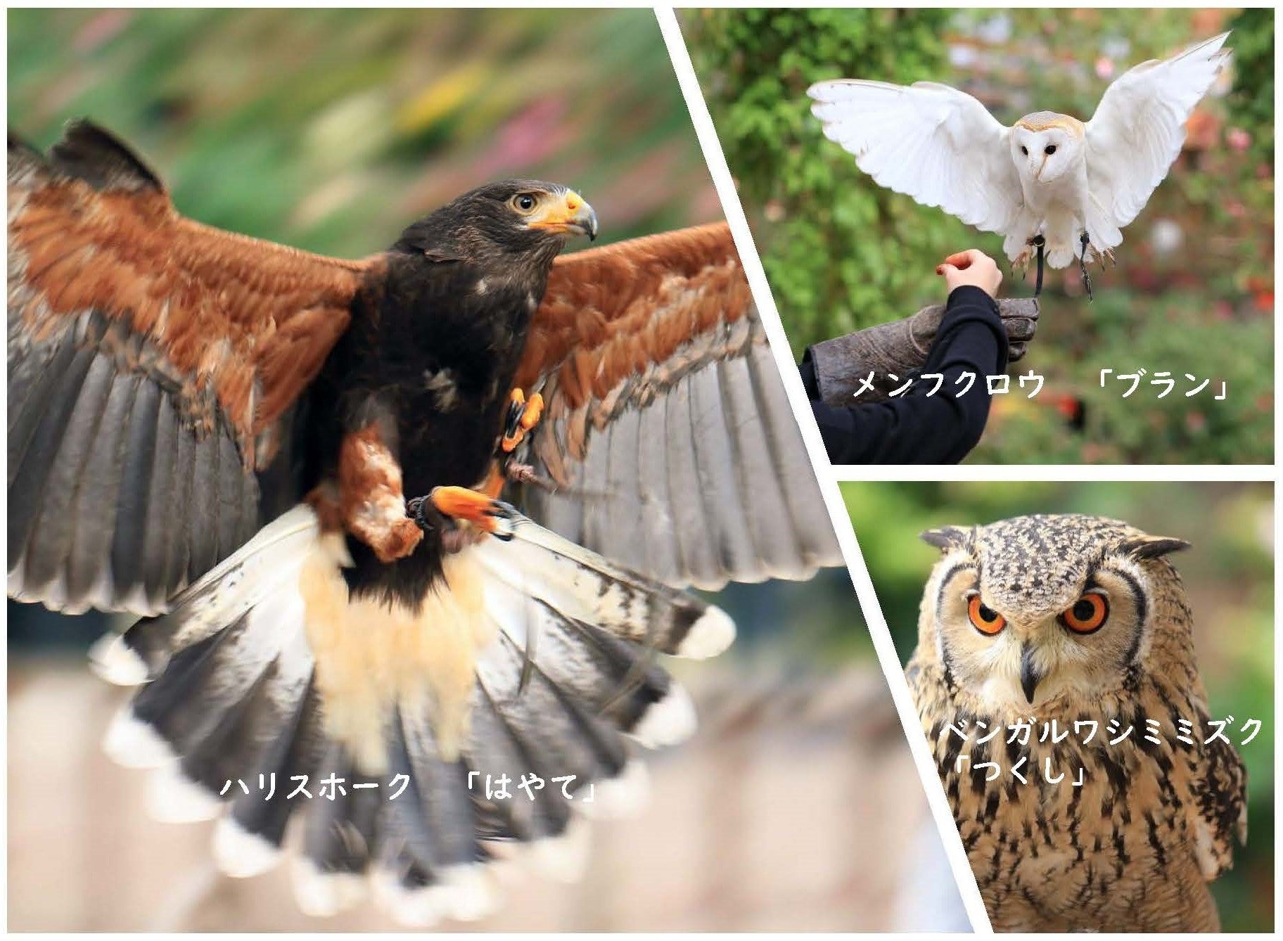 写真の鳥さん達は午前中のバードショーに登場するハリスホーク、メンフクロウ、ベンガルワシミミズクの面々。どの子がどの種類か全部当てたらあなたはゼッタイ猛禽類推しの人ですね。そして、この子たちのお名前は? すぐ分かった方、富士花鳥園推し、ありがとうございます! 正解は文末参照です。