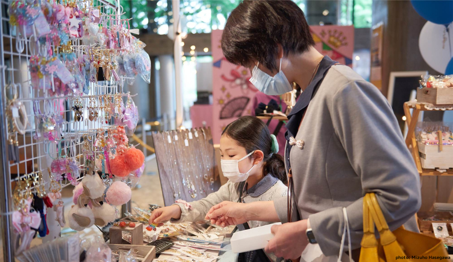 ⼤ホールホワイエがマルシェに⼤変⾝! バレエのレッスンで使えるものからバレエをモチーフにしたインテリア雑貨や食品など、バレエにまつわる様々な商品を扱う店舗が軒を連ねます。
