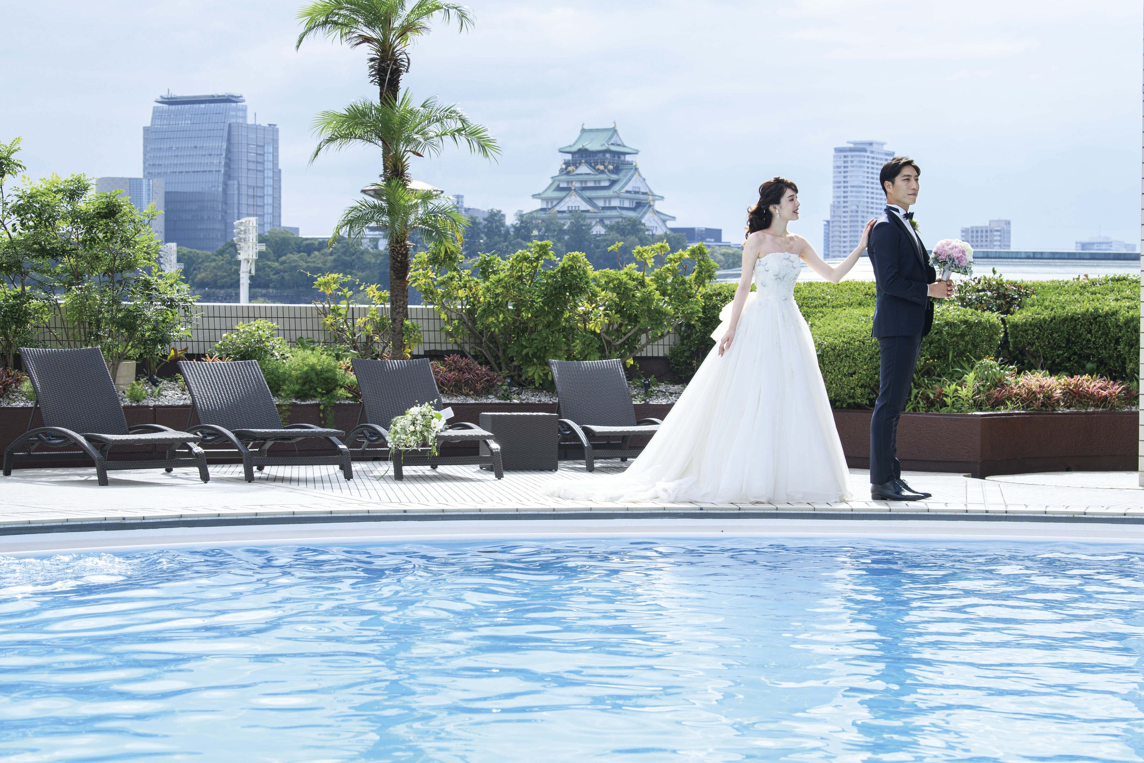 大阪市内随一の絶景を誇るアウトドアプールは、自然に囲まれた中でのパーティーが叶う、まさに都会の「リゾートウエディング」。水面の輝きがドレスに反射し、より一層ドレス姿を引き立たせます。カジュアルなパーティーにも最適な当プールでは、ビュッフェスタイルのお食事をご用意。遠出をしなければ叶わないのが「リゾートウエディング」。この機会に、大阪市内で気軽に体験してみませんか。