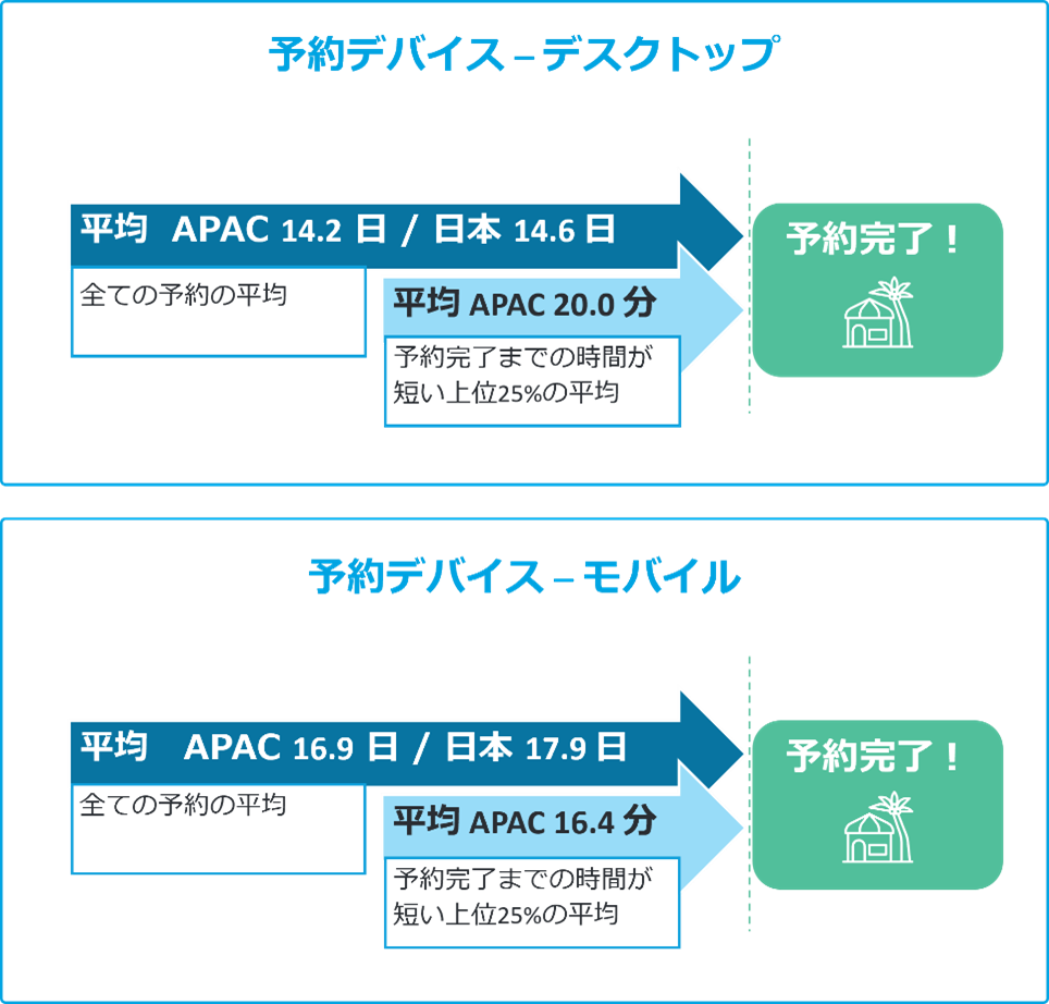 – 日本では、旅行者がデスクトップでの検索から予約までに要した時間は平均14.6日、モバイルでは平均17.9日と、APACの旅行者の中でも予約までにより時間をかける傾向