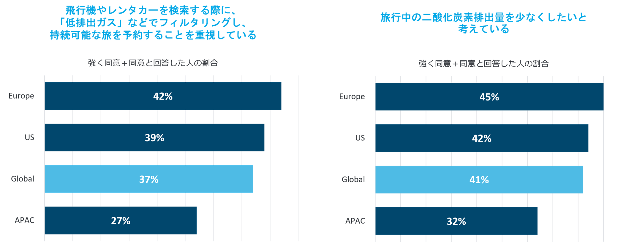 – “「低排出ガス」などでフィルタリングし、持続可能な旅を予約することを重視している”と回答した日本の旅行者は21%で、“旅行中の二酸化炭素排出量を少なくしたいと考えている”と回答したのは33%だった