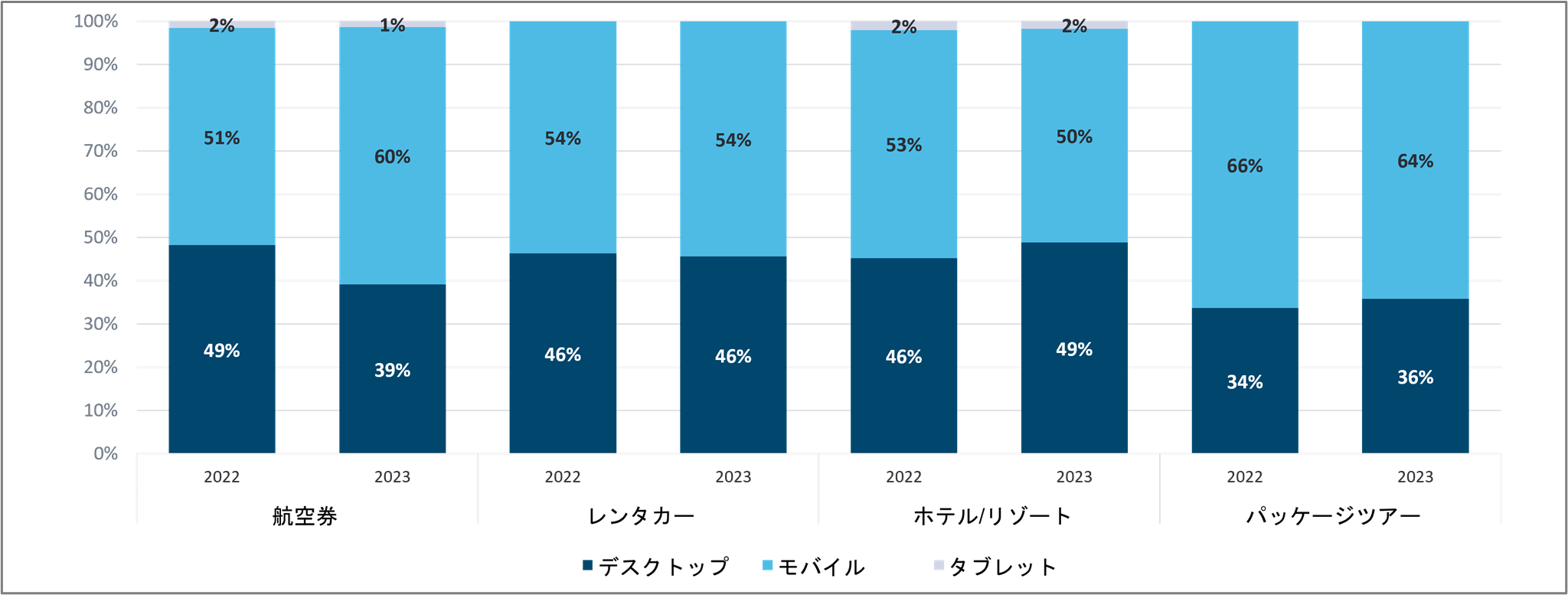 航空券はモバイルからの予約が2022年1月と2023年1月の間に51%から60%へと9ポイント増加
