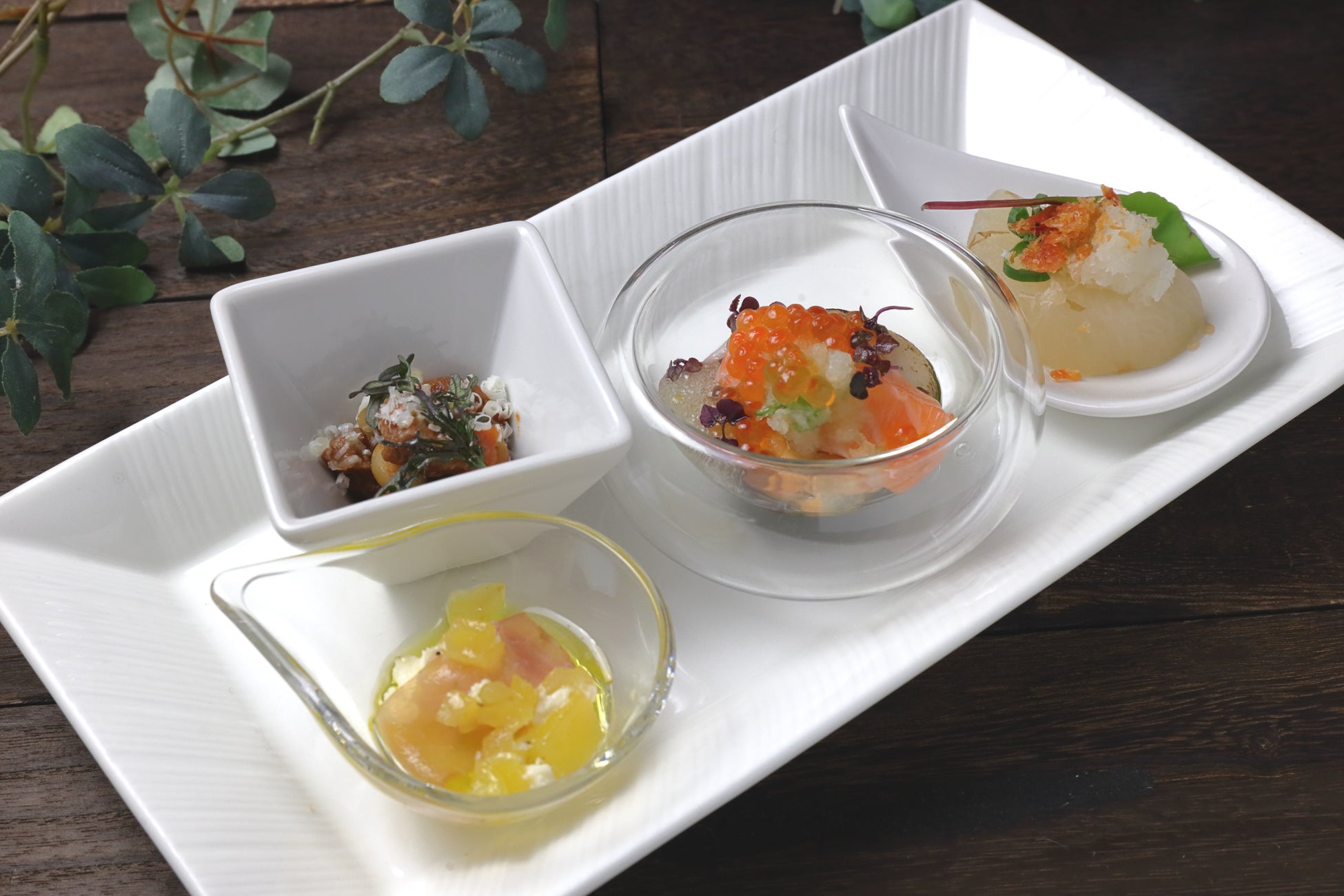 いくら、ほたて、たこなど魚介の旨味を存分に味わえる 前菜4種をのせたプレート。