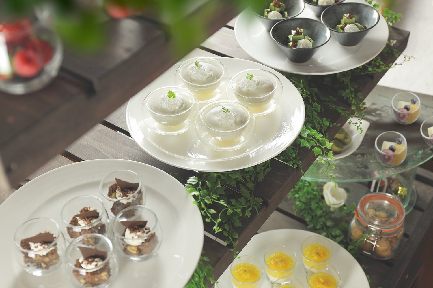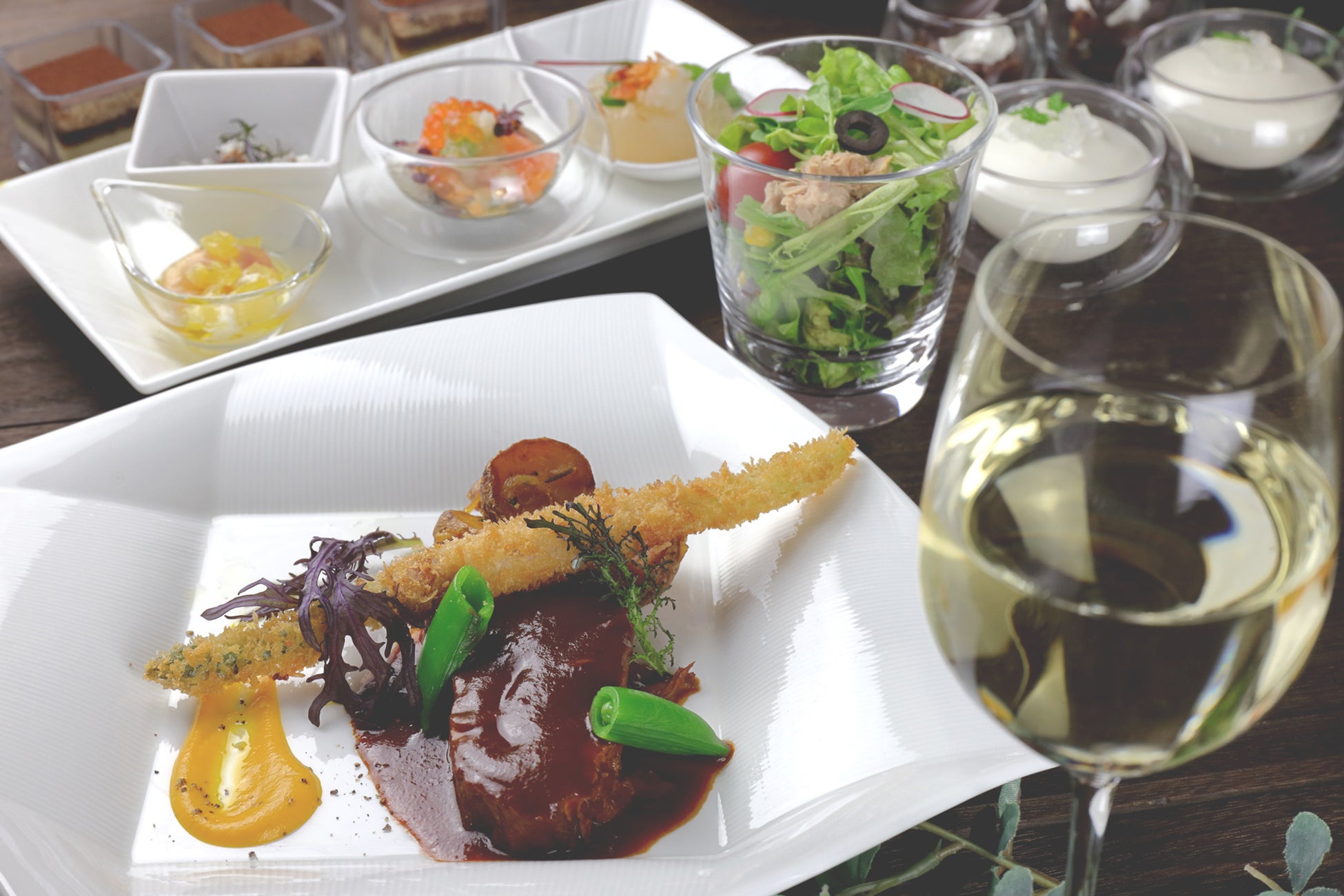 パン、ライス、スープ、スープカレー、サラダ、フルーツ、パティシエ特製デザート、ワイン(赤、白、スパーク リング)やコーヒーなどのドリンクバー。