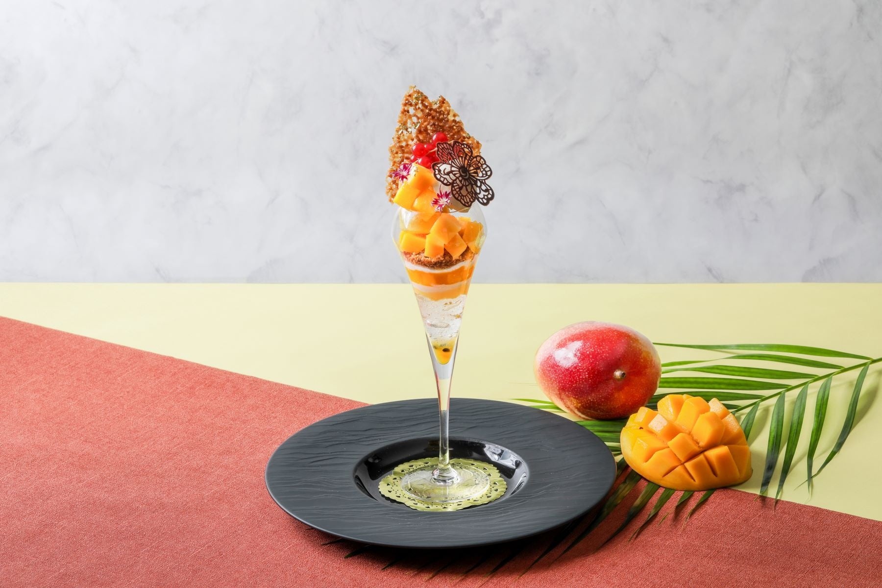 ホテル開業より大人気スイーツの“大人のご褒美パフェ”。第50作品目の今回は、夏を感じる“マンゴー”をテーマに、ヨーグルトのアイスやパッションフルーツソースなどを組み合わせた、甘みや酸味、爽やかな風味など、様々な味と食感を楽しめる内容に。