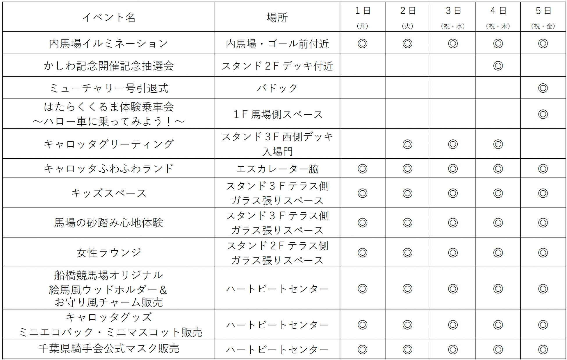 船橋ケイバでは、令和5年度第2回開催を5月1日(月)~5月5日(祝・金)に開催いたします。場内イベントのお知らせは次頁以降に詳細を記載しておりますのでご覧ください。また、5月3日(祝・水)・5月4日(祝・木)ついては事前予約制での入場とさせていただきます。※5月1日(月)・2日(火)・5日(祝・金)は事前予約不要ですが、滞留人数が3,000人を超えた時点で入場制限を行うことがあります。詳細は「令和5年度第2回船橋競馬の入場について」(https://blog.f-keiba.com/info/2023/03/post-d647.html)をご確認ください。