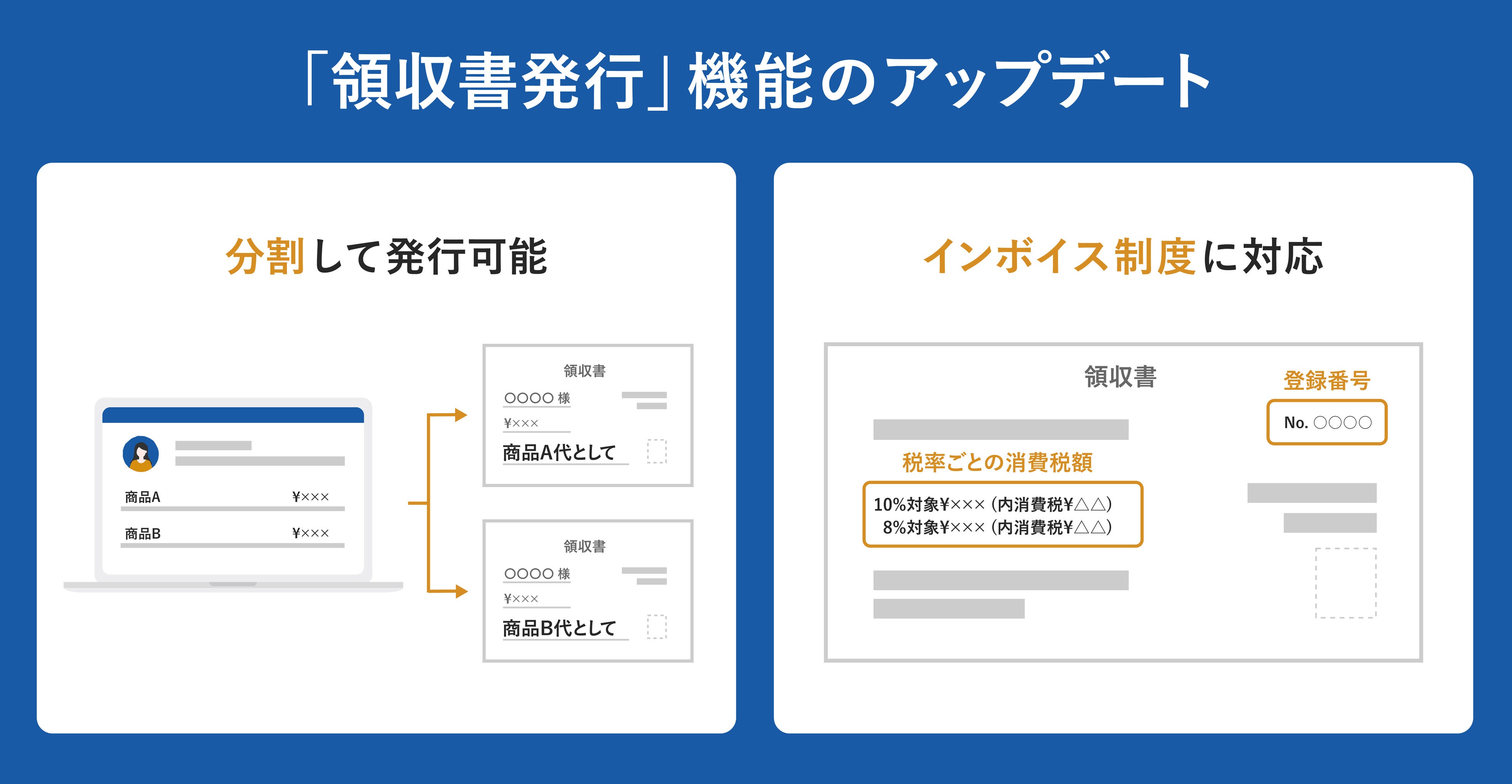 本機能により、宿泊時に領収書分割のご要望があった際、項目を選択するだけで必要な分の領収書を発行することが可能になるほか、2023年10月から始まる「インボイス制度」に対応し、新たに「登録者番号」「税率ごとの消費税額」が領収書の項目に追加されました。