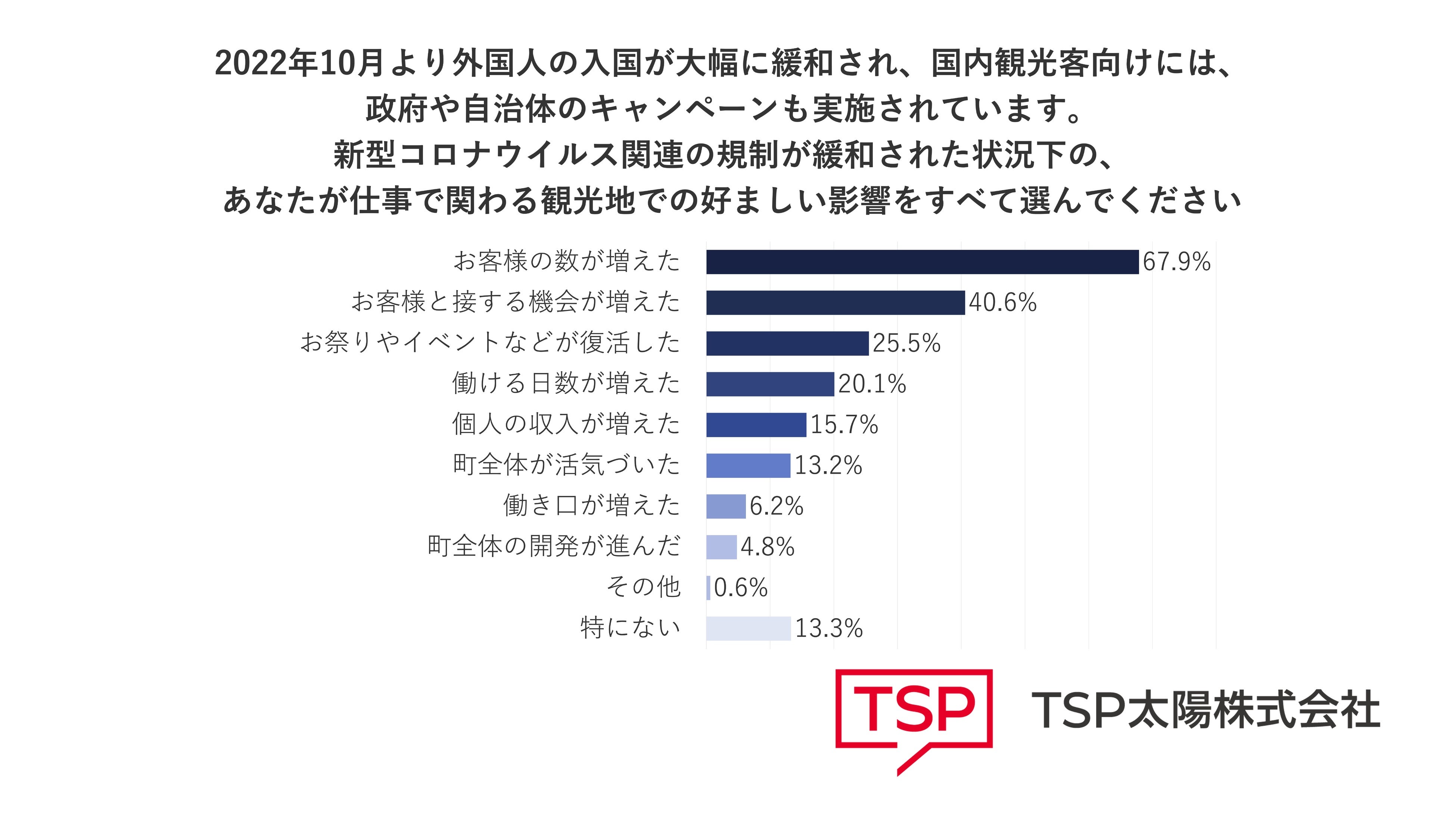「2022年10月以降、新型コロナウイルス関連の規制が緩和された状況下で観光地での好ましい影響をすべて選んでください」という問いに対し、「お客様の数が増えた」という回答が67.9%、「お客様と接する機会が増えた」40.6%、つづいて「お祭りやイベントなどが復活した」25.5%と、観光客数の増加を感じているという声が多く、また観光地の活気を取り戻しつつあることがわかります。