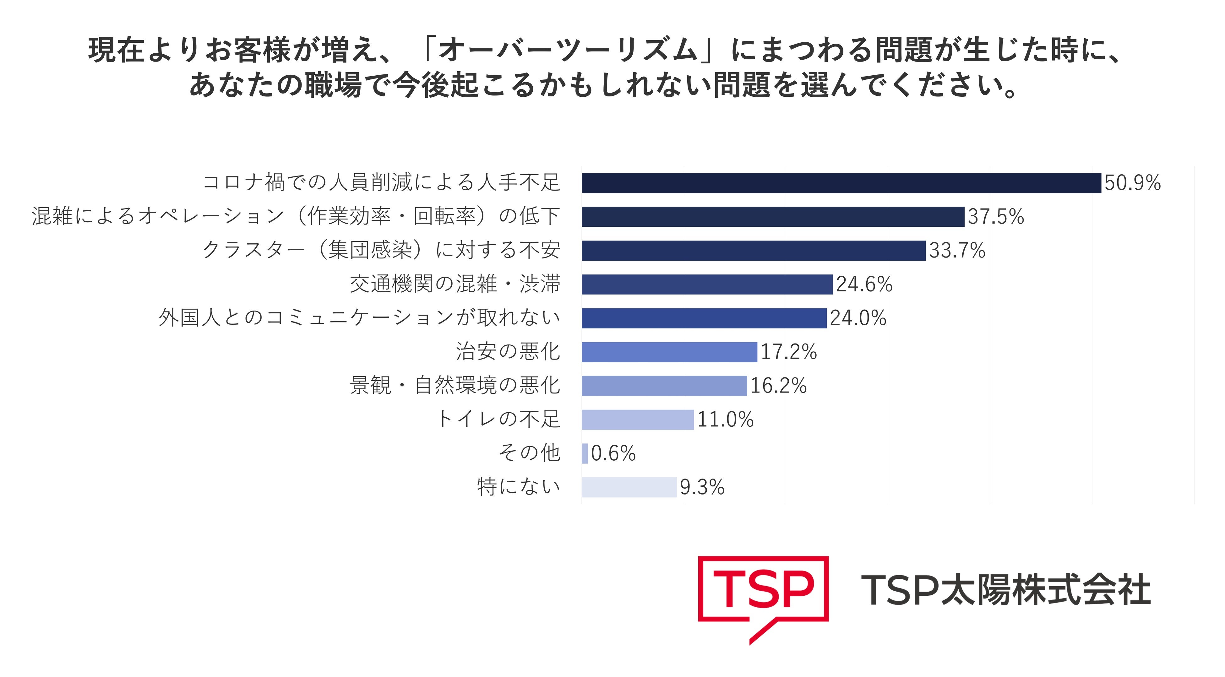 同様に、「今後起こるかもしれない問題」についても、人手不足(50.9%)、混雑によるオペレーションの低下(37.5%)、クラスターに対する不安(33.7%)、交通機関の混雑・渋滞(24.6%)となっています 。また現状は顕在化していないものの、今後訪日外国人の増加に伴い、外国人とのコミュニケーションに不安を覚える方も多いようです。