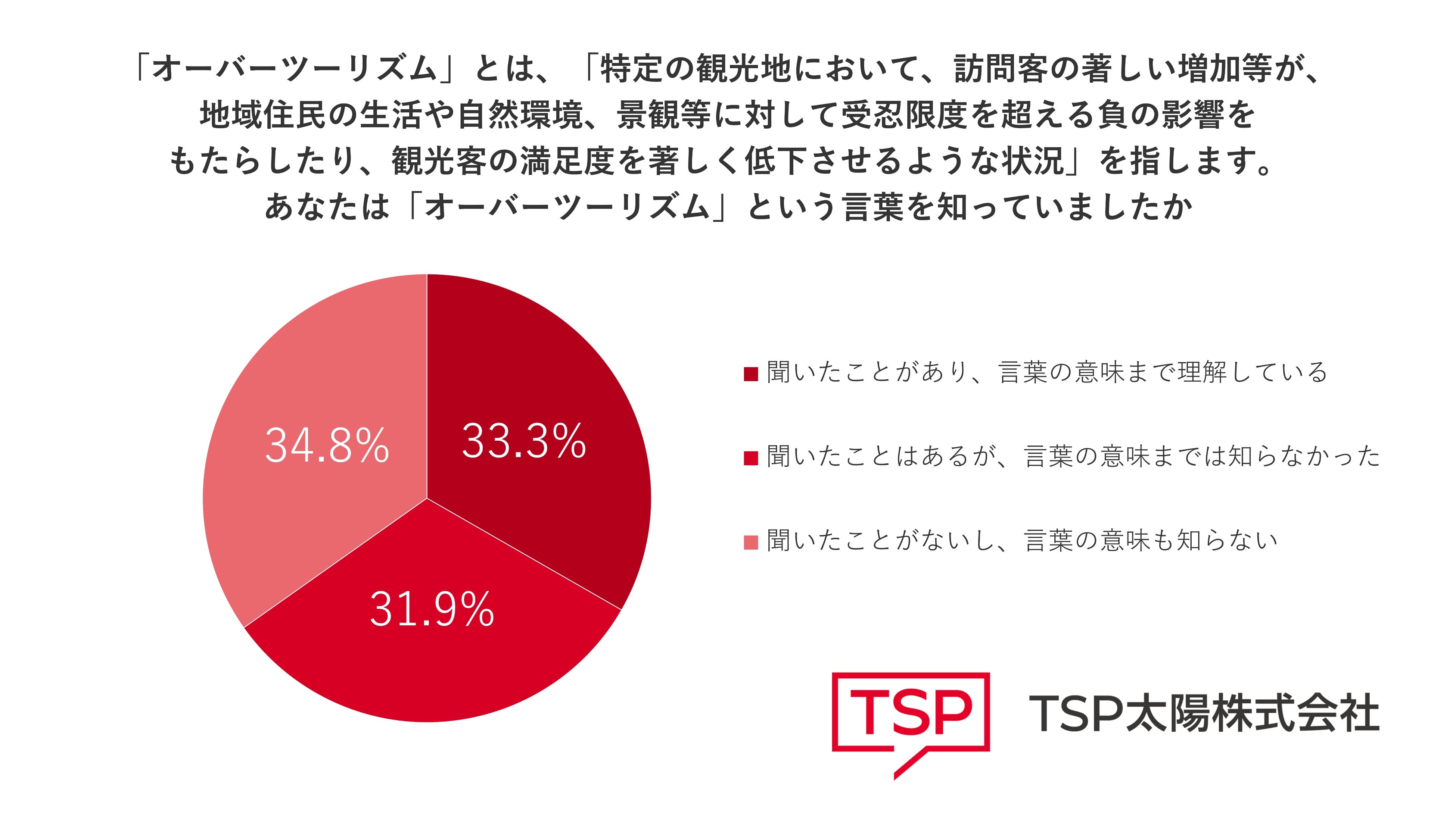 「『オーバーツーリズム』という言葉を知っていますか?」という問いに対し、「聞いたことがあり、意味を知っている」という回答が33.3%、「聞いたことはあるが、言葉の意味までは知らなかった」31.9%、「聞いたことがない」34.8%という結果でした。オーバーツーリズムという言葉を知っている・聞いたことがあるという回答が約6割を超えていることからも、観光業にかかわる従事者にとっては、注目の話題であることがわかります。