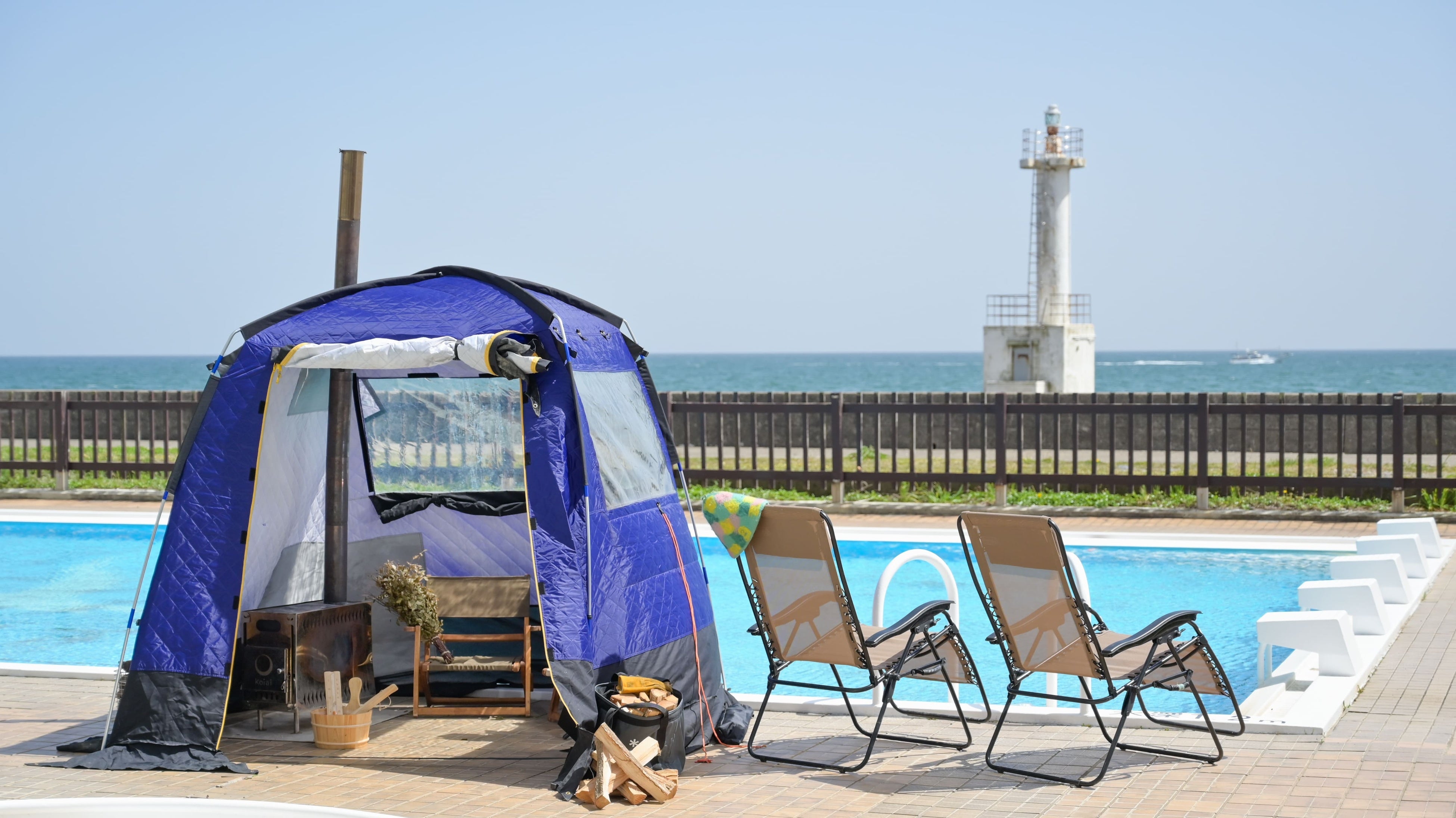 プールエリアにて、波の音を聞きながら海を眺めてととのえる♪