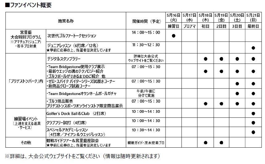 大会会場にはブリヂストングループのサステナブルな取り組みや商品・技術を体験・体感いただける「ブリヂストンパーク」を設置し、60周年の節目を迎えたブリヂストンのモータースポーツ活動のご紹介、月面タイヤや自転車、免震ゴムといった当社グループの様々な取り組みを実際に見ていただける展示や体験イベントをはじめ、『心動かす「ゴルフのわくわく」を提供しつづける』という大会コンセプトの体現のため、ゴルフファンの皆様、これからゴルフを始める皆様との特別な接点の場としてさまざまなファンイベントを実施します。