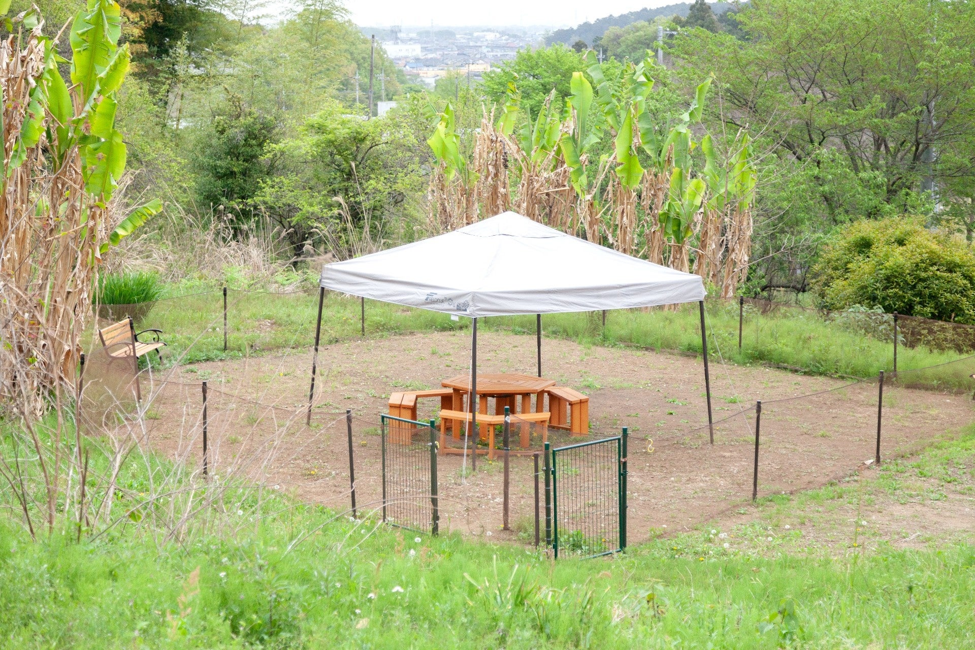 かねてよりワンちゃん連れのお客さまから「どこかお散歩や走り回れるスペースはありませんか?」というご質問を多くいただいておりました。そこで今回、愛犬家のスタッフが自ら近隣の耕作放棄地を整備し、約30㎡のドッグランをつくりました。宿泊者だけではなく、日帰りのお客さまにもご利用いただけます。また、隣にある400㎡の天然芝のフリーエリアについても、キャンプ区画外の場所については、リードを付けてのお散歩が可能です。