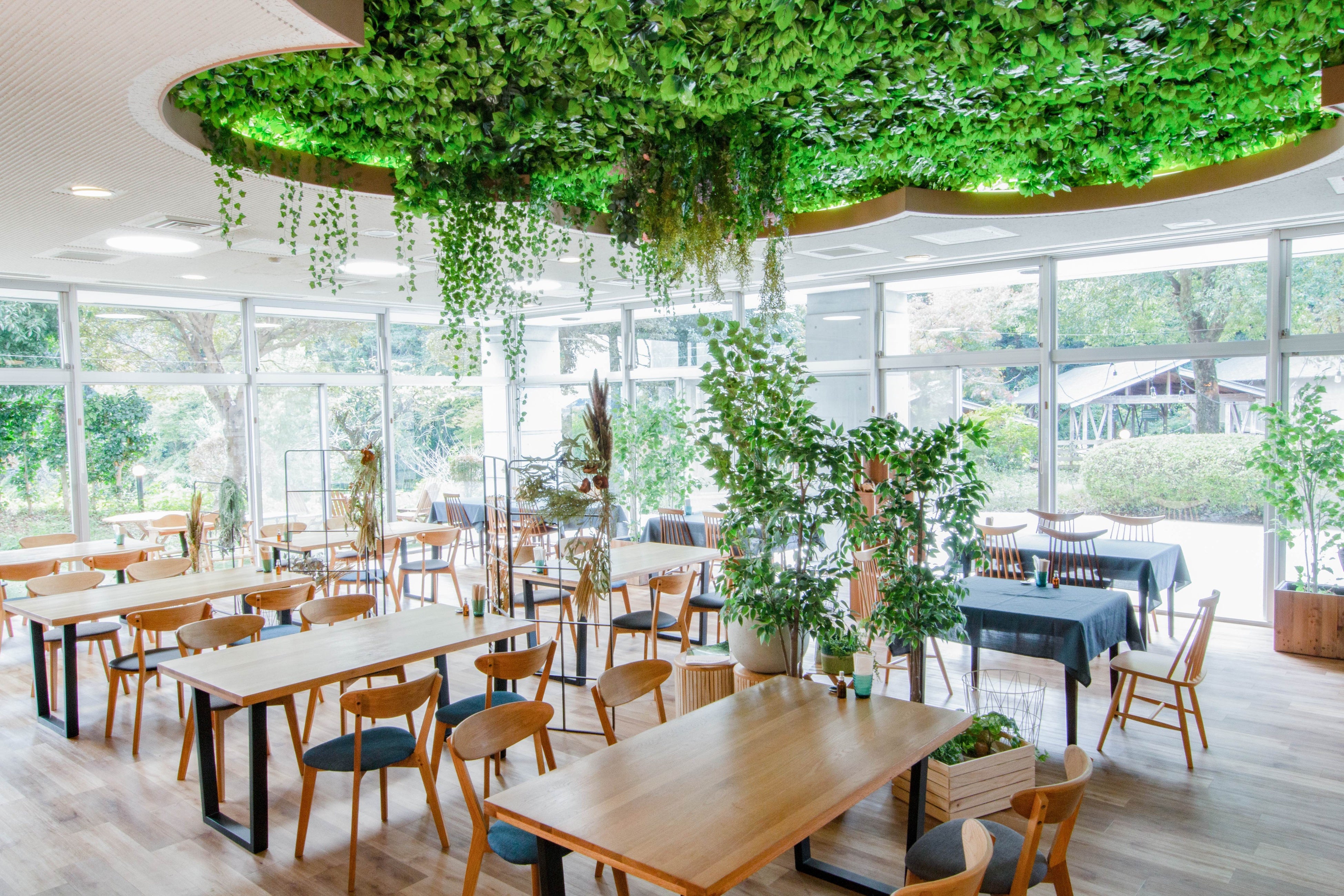 レストランMORINIWAでは屋外テラス席のご利用が可能です。(席数に限りあり) 新緑に囲まれた自然あふれる空間で、ワンちゃんとのランチタイムをお楽しみください。