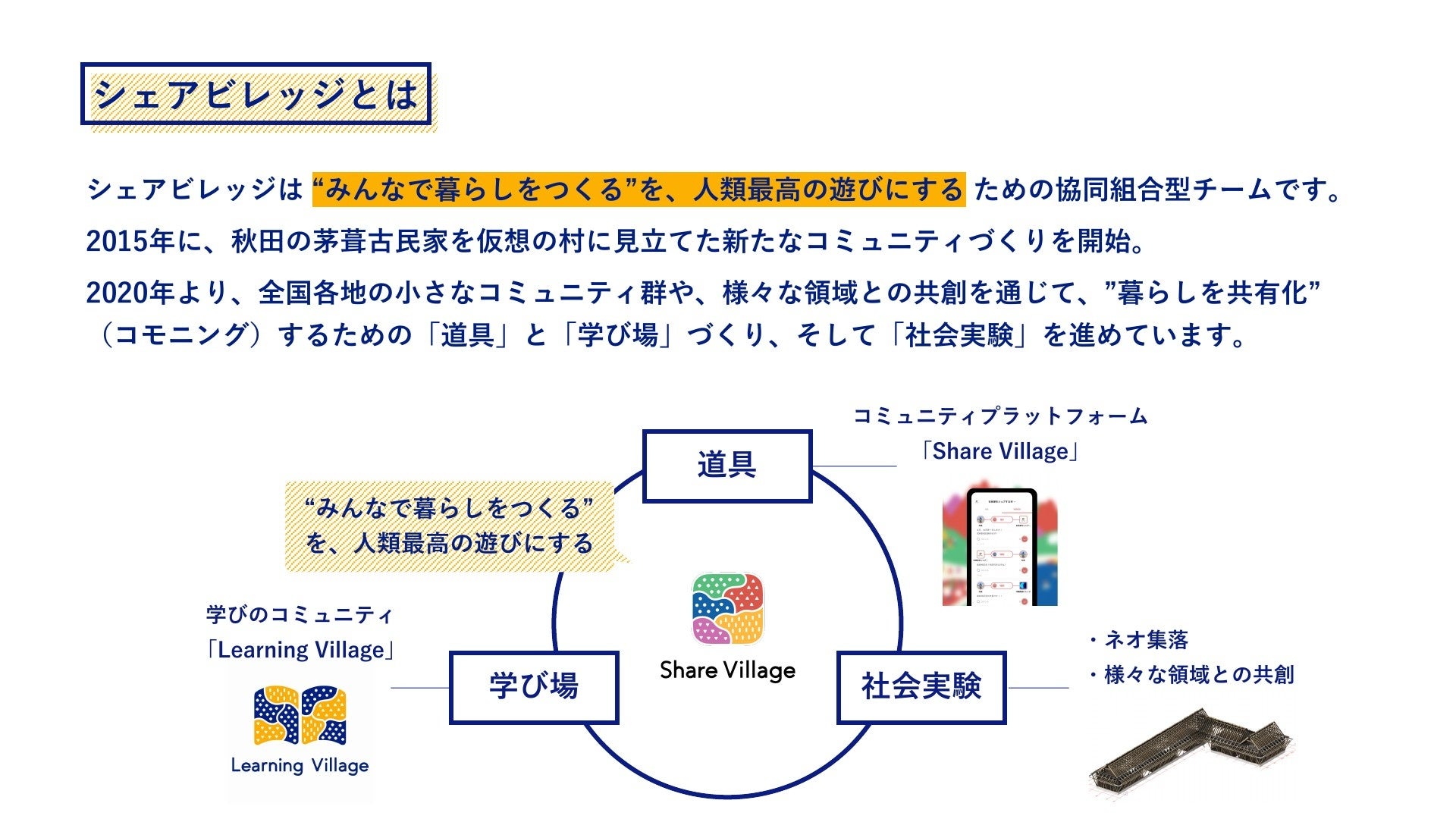 当社が掲げる、”みんなで暮らしをつくる”を、人類最高の遊びにするために、ラーニングビレッジの運営を通して、学びのコミュニティを育んでいます。