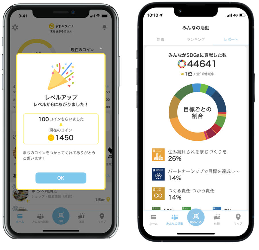 参加頻度でボーナスポイントが付与されたり、ポイントが増えるとレベルアップしたりと、ゲームのように楽しみながら、自然と地域活動に参加する機会を創出します。後からまちのコインの「活動履歴」をみることで、自分の行動がどのSDGsのゴールにつながっているか振り返ることもでき、SDGsの自分ごともつながります。