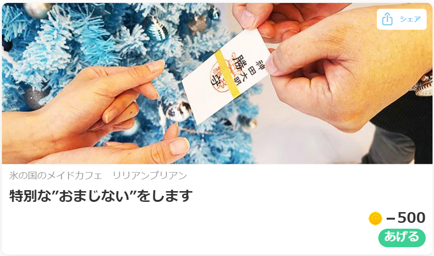 獲得したアキコは各スポットでの体験に利用が可能です。例えば、「メイドさんが御守に特別なおまじないをします(500アキコ)」や「ホテル内の1200冊の漫画が1時間読み放題(500アキコ)」、「クレーンゲーム1回無料(100アキコ)」など、秋葉原をさらに楽しめるちょっとうれしい体験ができます。