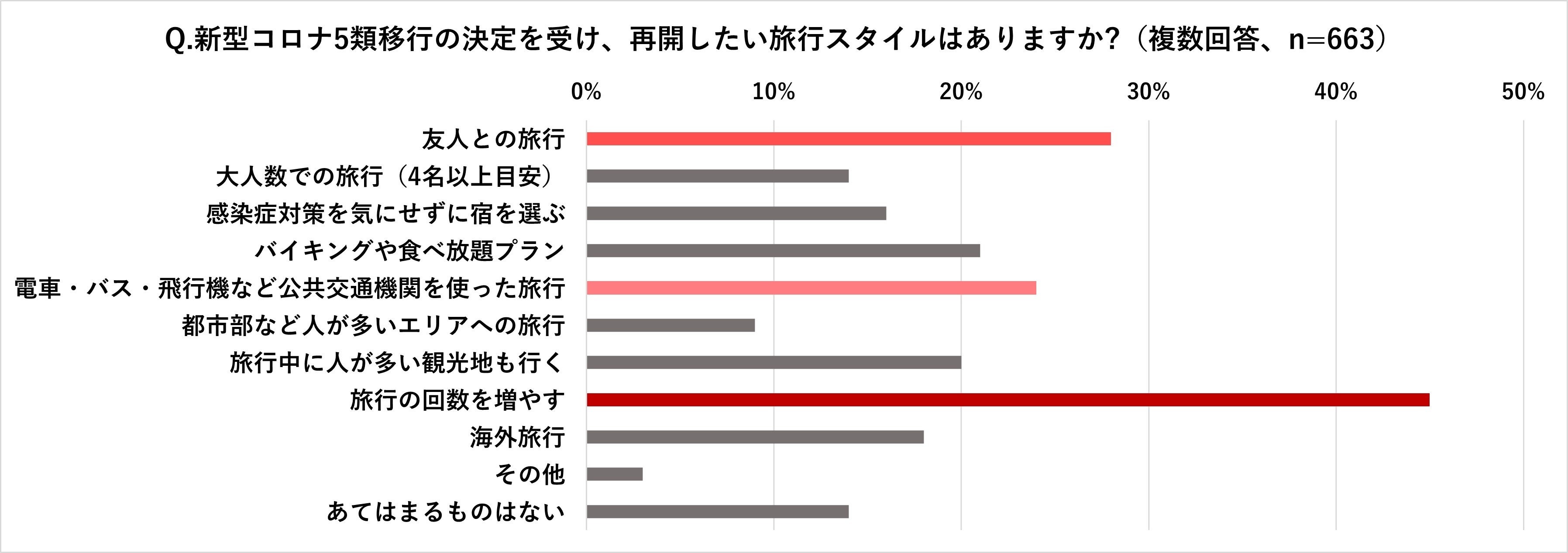 • 新型コロナ5類移行で自由な旅を望む声が52%。まずは「回数を増やしたい」という結果に。