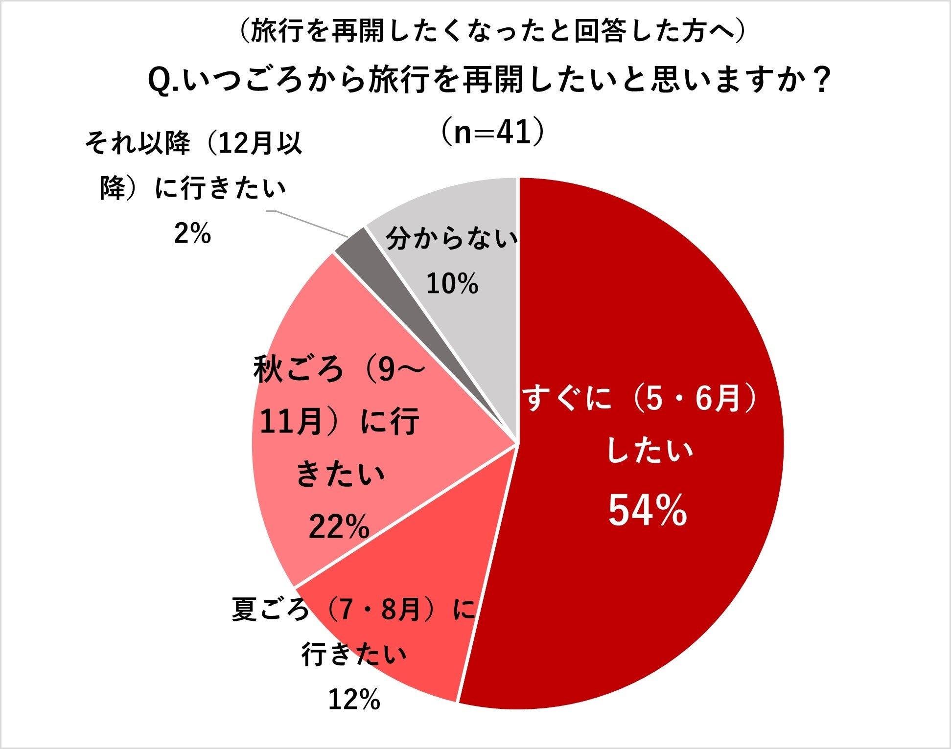 新型コロナ5類移行の決定を受け「旅行を再開したくなった」「ややしたくなった」と回答した方に対し、いつごろから再開したいか尋ねたところ、「すぐに(5・6月)したい」54%、「夏ごろ(7・8月)に行きたい」12%、「秋ごろ(9月~11月)に行きたい」22%と、年内には旅行を再開したいという方が88%にのぼりました。