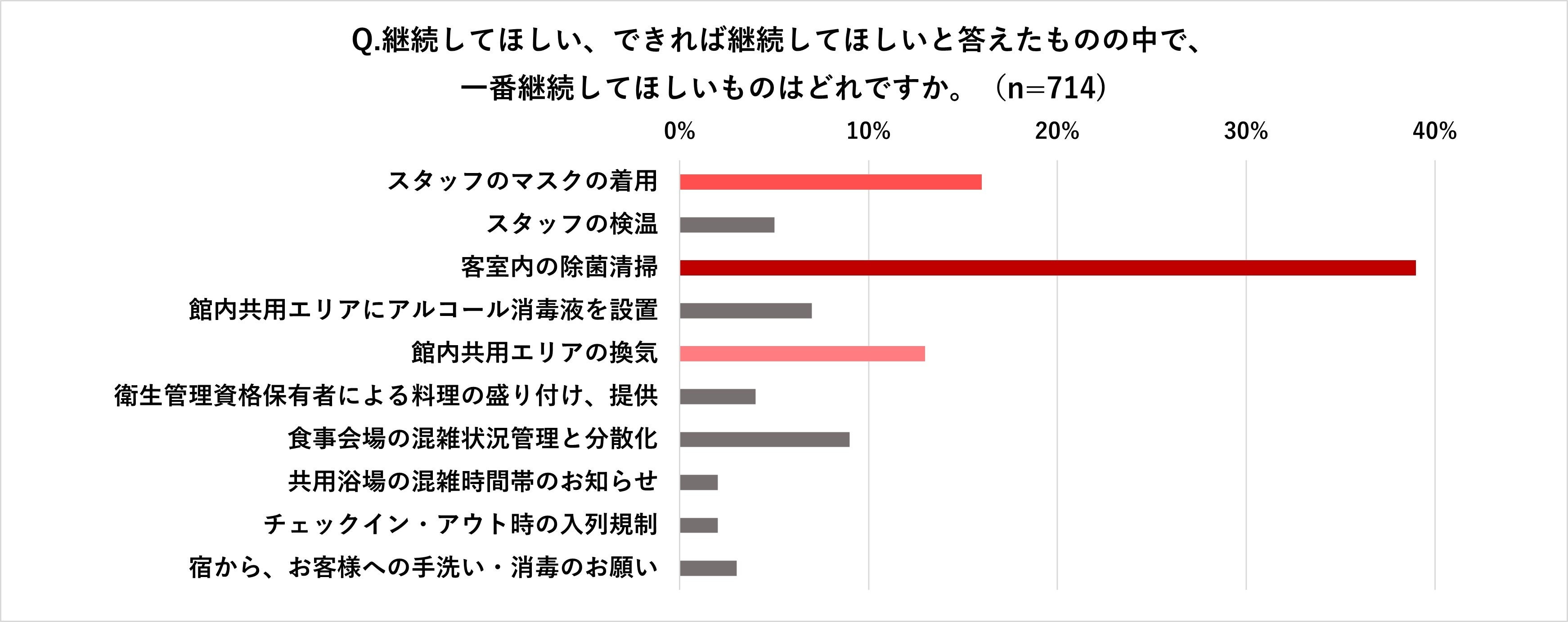 宿泊施設や観光施設における感染症対策は、実に91%の方が継続を希望していることがわかりました。いずれの感染症対策も継続を希望する声が多く集まりましたが、もっとも希望する感染症対策は「客室内の除菌清掃」で、次に「スタッフのマスク着用」「館内共用エリアの換気」と続きました。 「客室内の除菌清掃」を希望する理由は「一番長くいる所だから(55~59歳女性)」、「マスクを外せる唯一の場所(70歳以上男性)」、「不特定多数の使用があるため(70歳以上男性)」など、くつろぎの空間である客室で感染をしたくないといった想いがうかがえます。