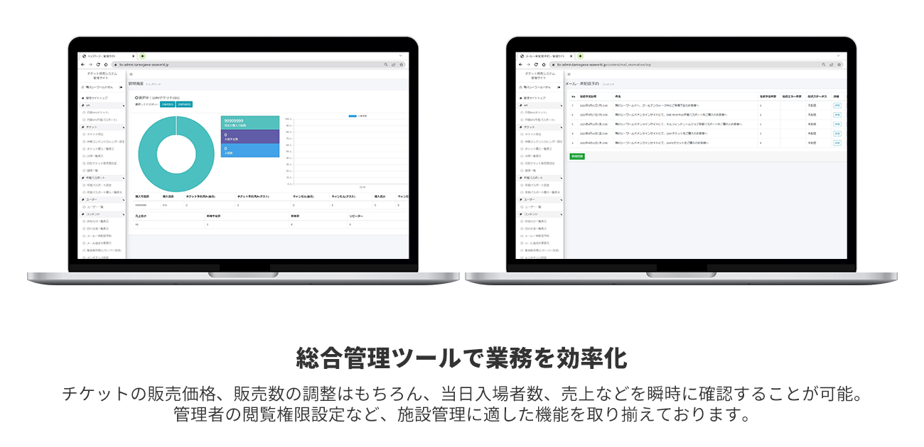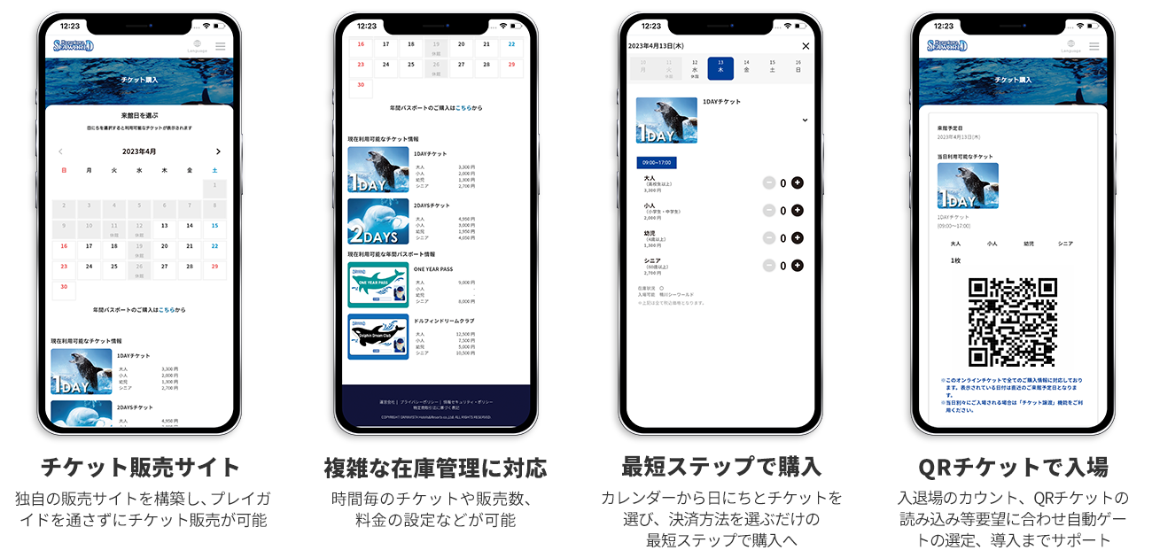 各社公式サイトにて事前にオンラインチケットを購入、ならびにQRチケット表示での現地認証によるスムーズな入場管理、管理者に最適化されたチケット販売の多種多様な機能等、チケッティングに関わる皆様に快適な時間を過ごしていただくことを目指し、開発致しました。