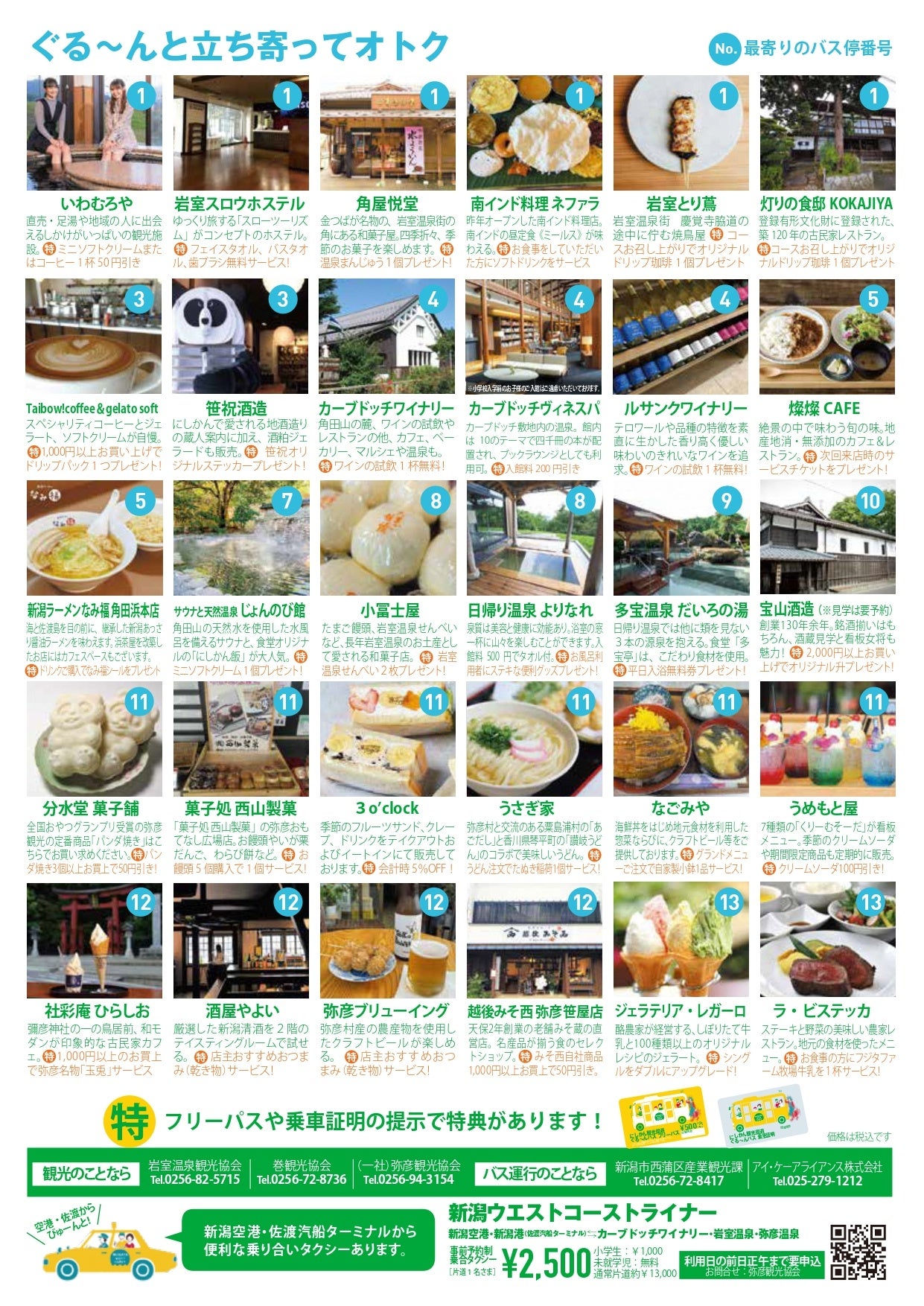 ■バス停:いわむろや、JR巻駅前、上堰潟公園、カーブドッチワイナリー、角田浜、浦浜、じょんのび館、岩室駐車場、だいろの湯、宝山酒造、JR弥彦駅、彌彦神社前、レガーロの13箇所