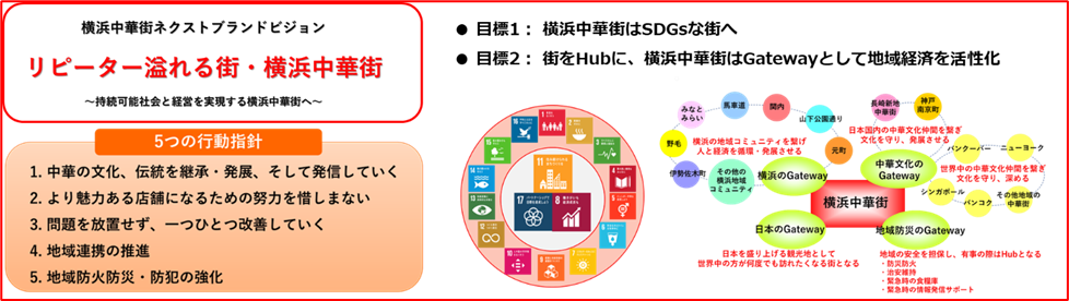商店街の組合としては国内有数の大きな組織で、2020年1月、次の10年に向けてのネクストブランドビジョンと、ビジョンを達成するための行動指針と2つの目標を掲げ、横浜中華街の発展と地域経済の活性化を目指して、中華の文化・伝統行事を中心に、閑散期の売り上げアップ支援、環境負荷低減、新型コロナ感染予防対策、治安維持など、様々な視点から街と地域経済活性に寄与する様々な活動を行っています。