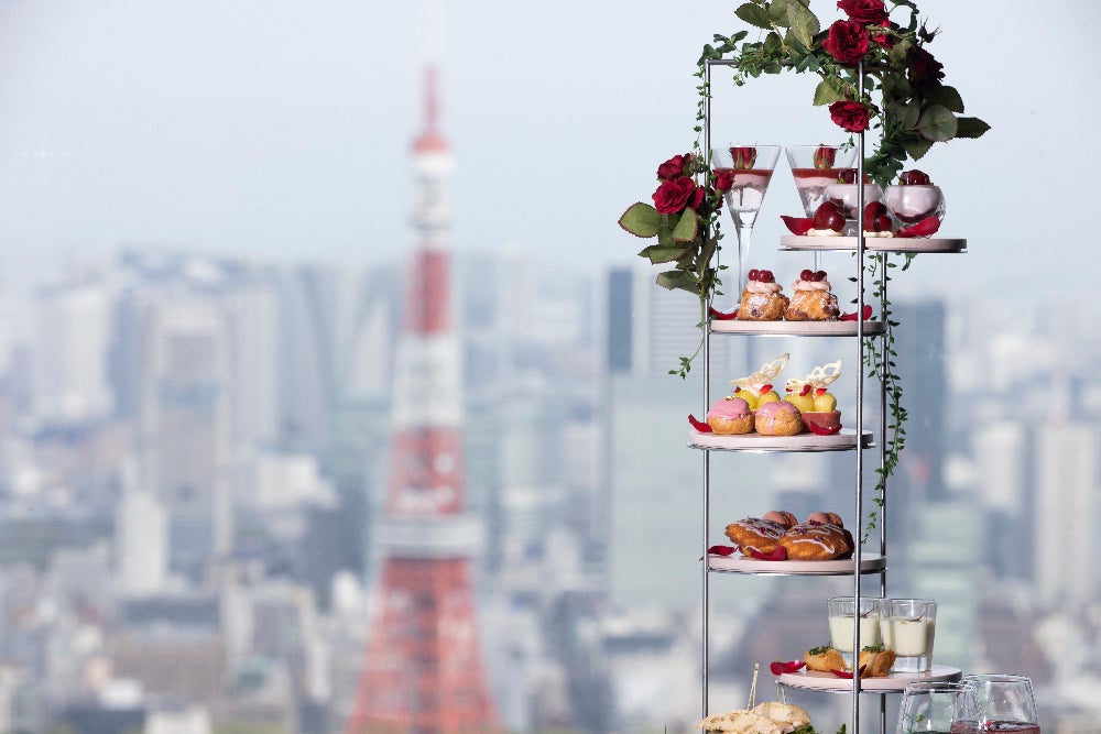 「THE MOON」は、 “天空の森”をコンセプトに東京の絶景を一望しながら食事を楽しめるレストランです。この度スタートするアフタヌーンティーは、六本木ヒルズ森タワーのシルエットと店名「MOON(=月)」をイメージした高さ70cmを超えるスタンドに、有機栽培された膨潤な香りの食用薔薇「さ姫」を贅沢に使用したパフェやマドレーヌなどパティシエこだわりのスイーツ8種と、枝豆のポタージュや帆立のパートブリック包みなど初夏を感じるセイボリー4種を楽しめます。