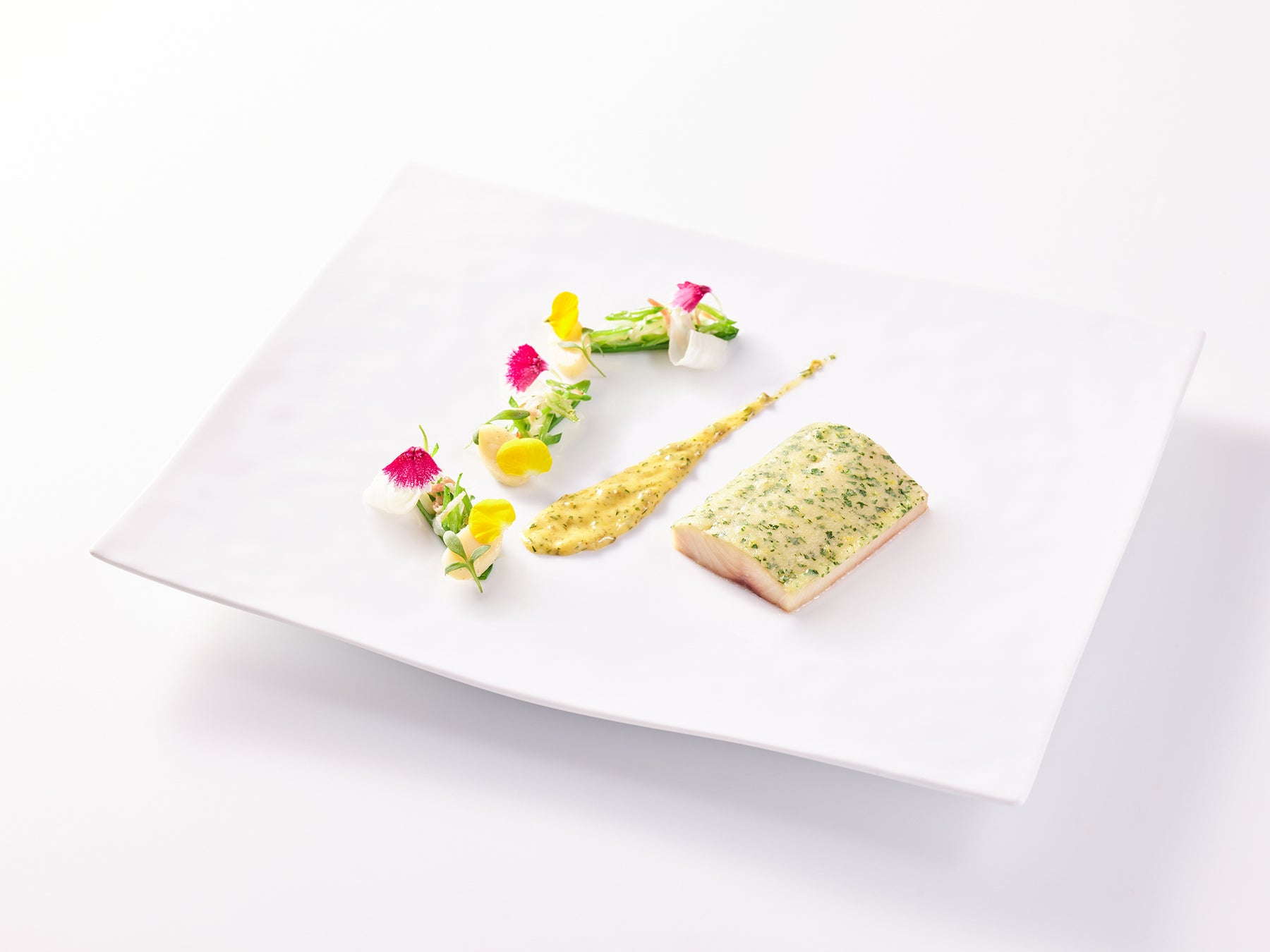 上品な味わいのオンブルシュヴァリエに針葉樹とシャルトリューズの⾹りを纏わせ、柑橘の⾵味と新芽のハーブ⾹るヴィエノワ―ズに、バターの芳醇な香りと旨味にほど良い酸味を合わせた、グルノーブル風のムースリーヌでお楽しみ頂きます。