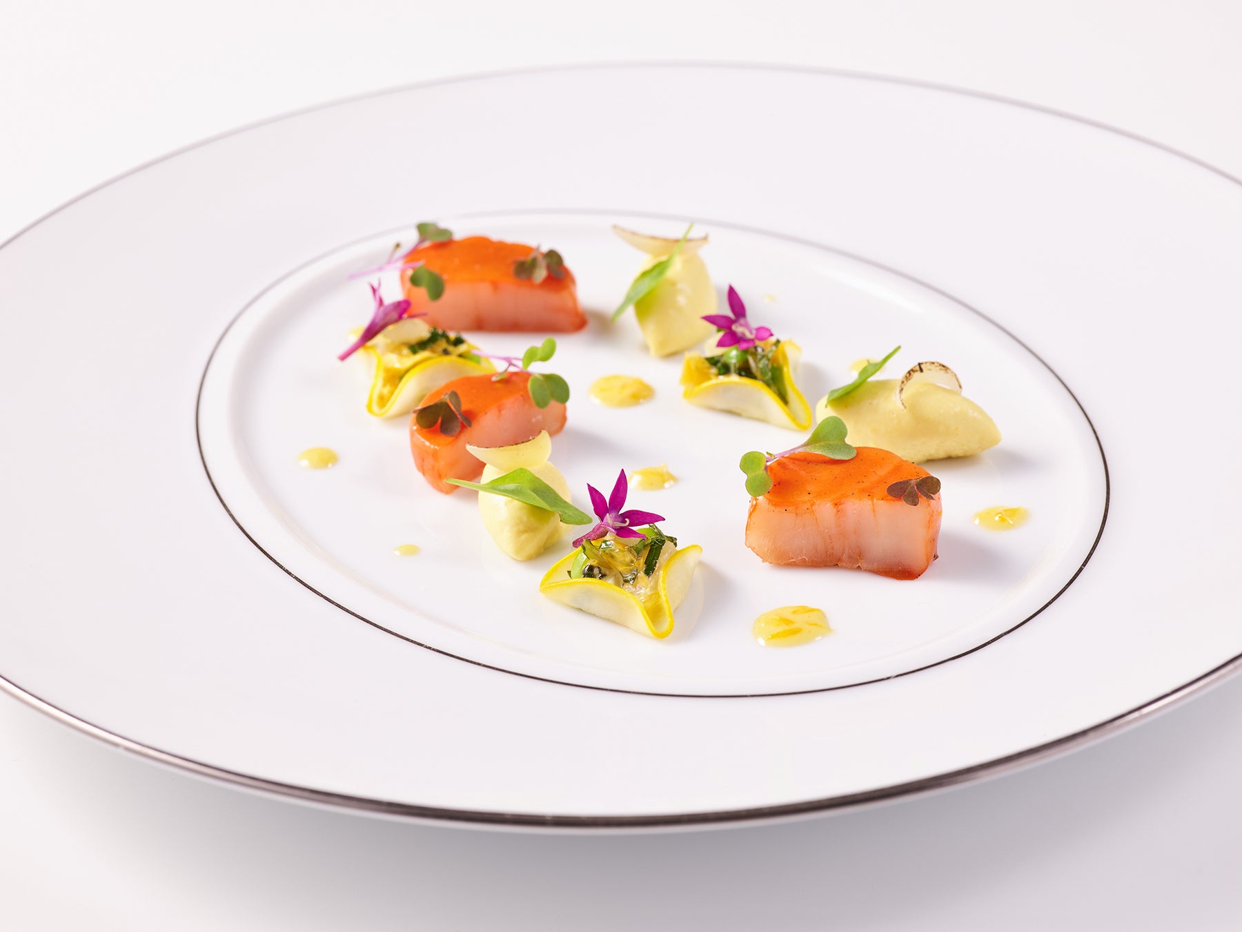 爽やかな風味のタスマニア産胡椒と甘美なカロテンを合わせた帆立貝、香気なサフランと帆立貝の風味豊かなムースとオレンジが香るすっきりとした味わいのサラダサンジェルマンをあしらった冷前菜です。