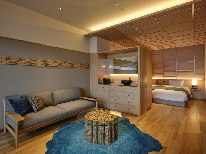 洞爺湖の優雅な自然風景を望むスイートルーム。ゆとりある空間にはイタリア高級家具アルフレックスの最上級ソファや寝室にはダブルサイズのベッド2台が設置され、自然を体感する贅沢な空間となっております。