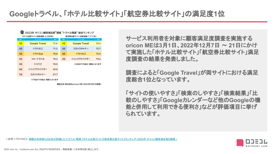Googleトラベル「ホテル&航空券比較サイト」満足度1位に