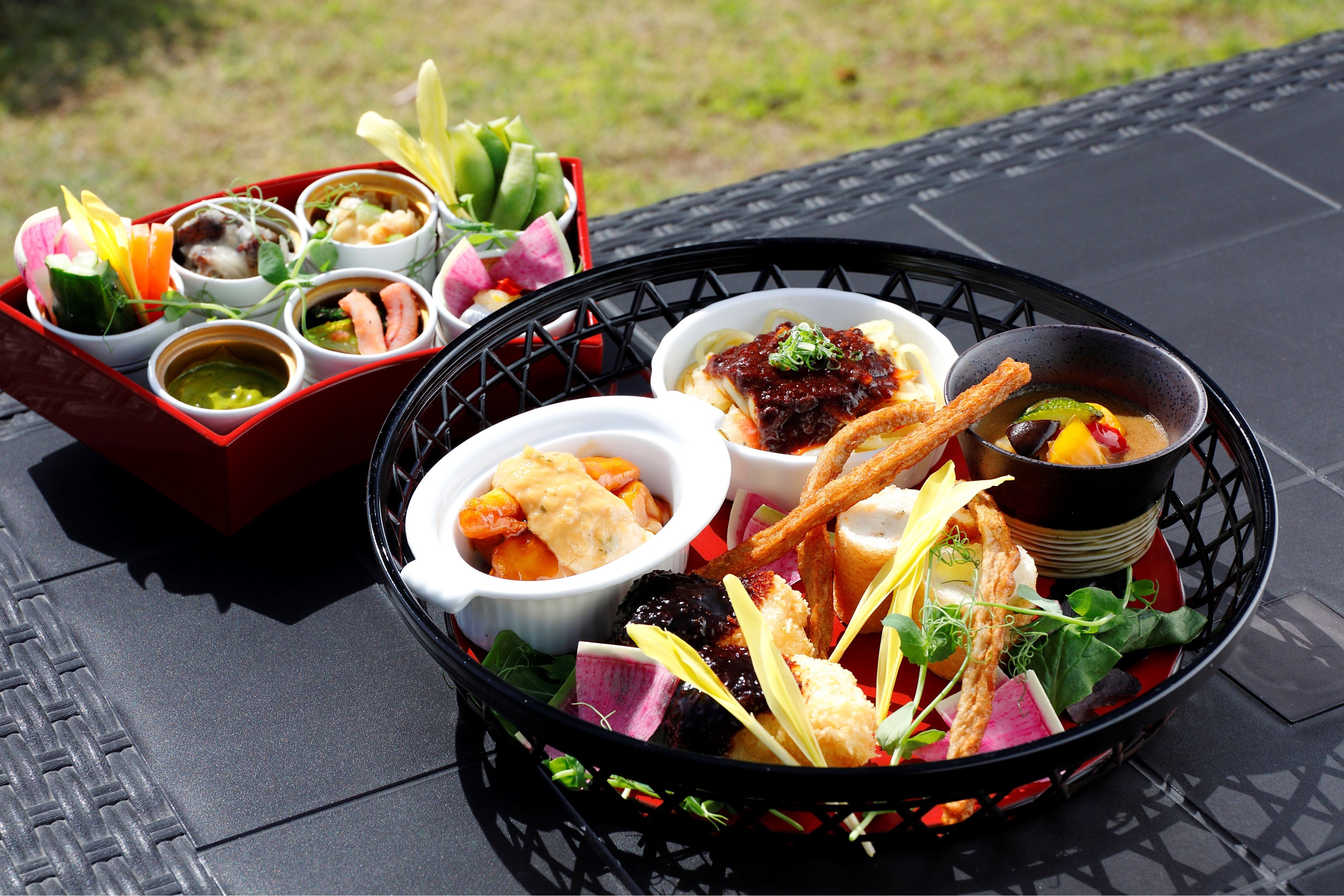 お料理はシェフ厳選の日本各地のご当地グルメをご用意いたします。北海道グルメとして「野菜スープカレー」や沖縄グルメとして「ミミガーと胡瓜の和え物」など、全12種類のご当地グルメが大集結。タルタルソースに奈良漬けを使用した宮崎県グルメとして「チキン南蛮」や、奈良県産の大和まなを使用した福岡県グルメとして「焼き烏賊と大和まな 辛子明太子和え」など、ご当地グルメと奈良県産食材のコラボレーションもお楽しみいただけす。