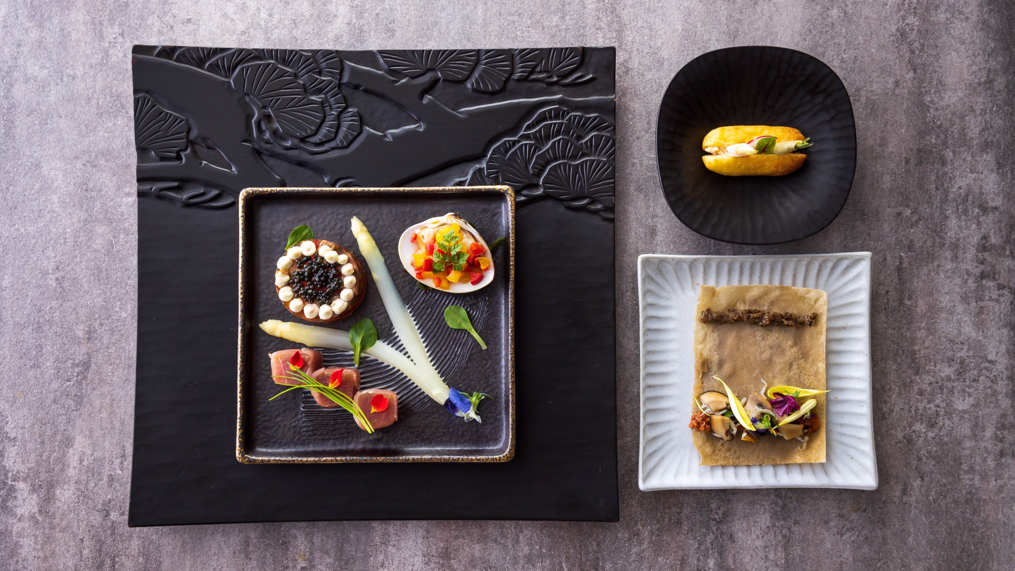 香草チーズと鎌倉ハム 野菜のエクレア仕立て、そば粉のクレープ、鮪の生ハム巻き、葉山牛と彩り野菜のゼリー寄せ キャビア飾り、蛤のエスカベッシュ