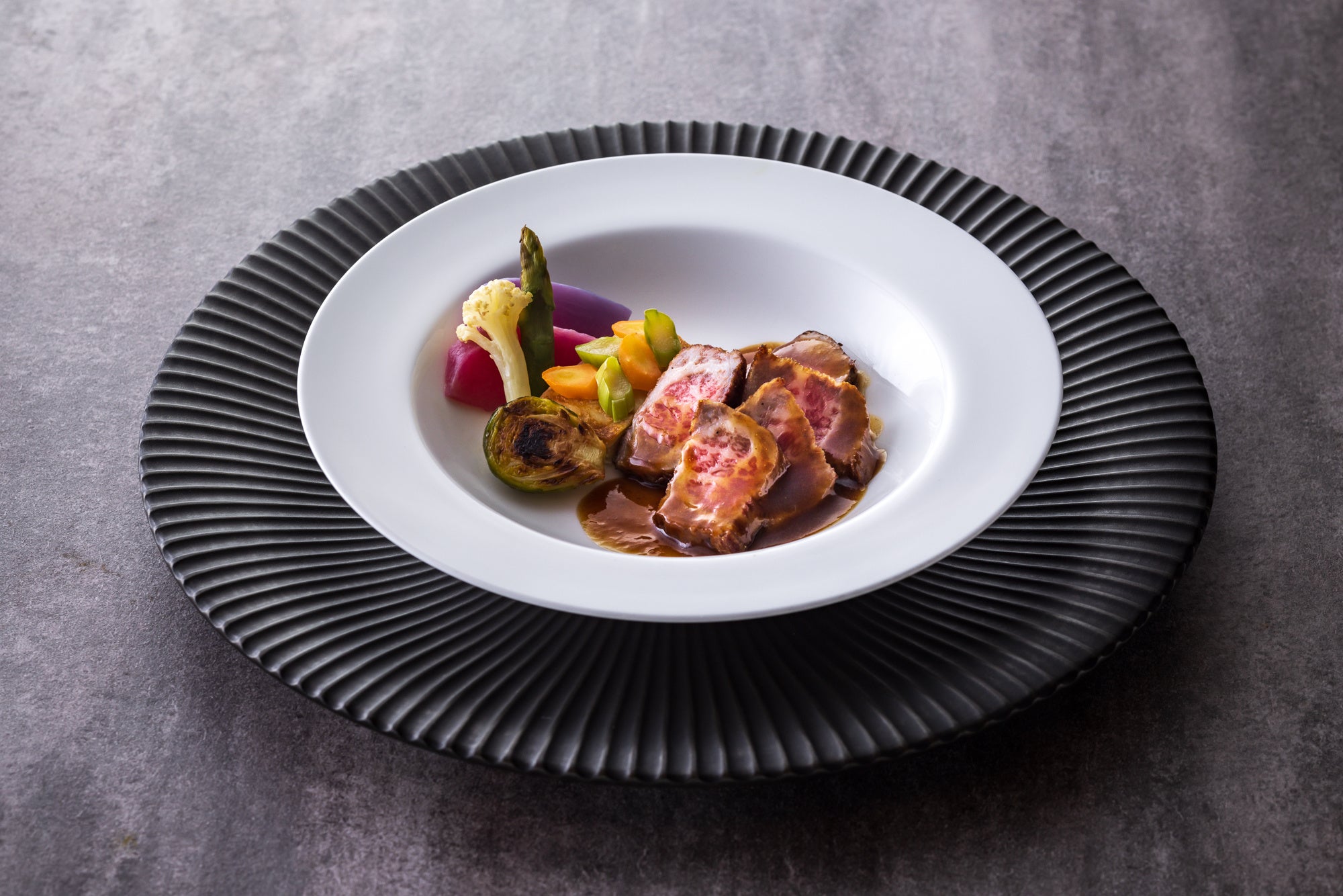 葉山牛のロティ グレイビーソースとワサビクリーム または 葉山牛のポッシェ コンソメのマスタードソース