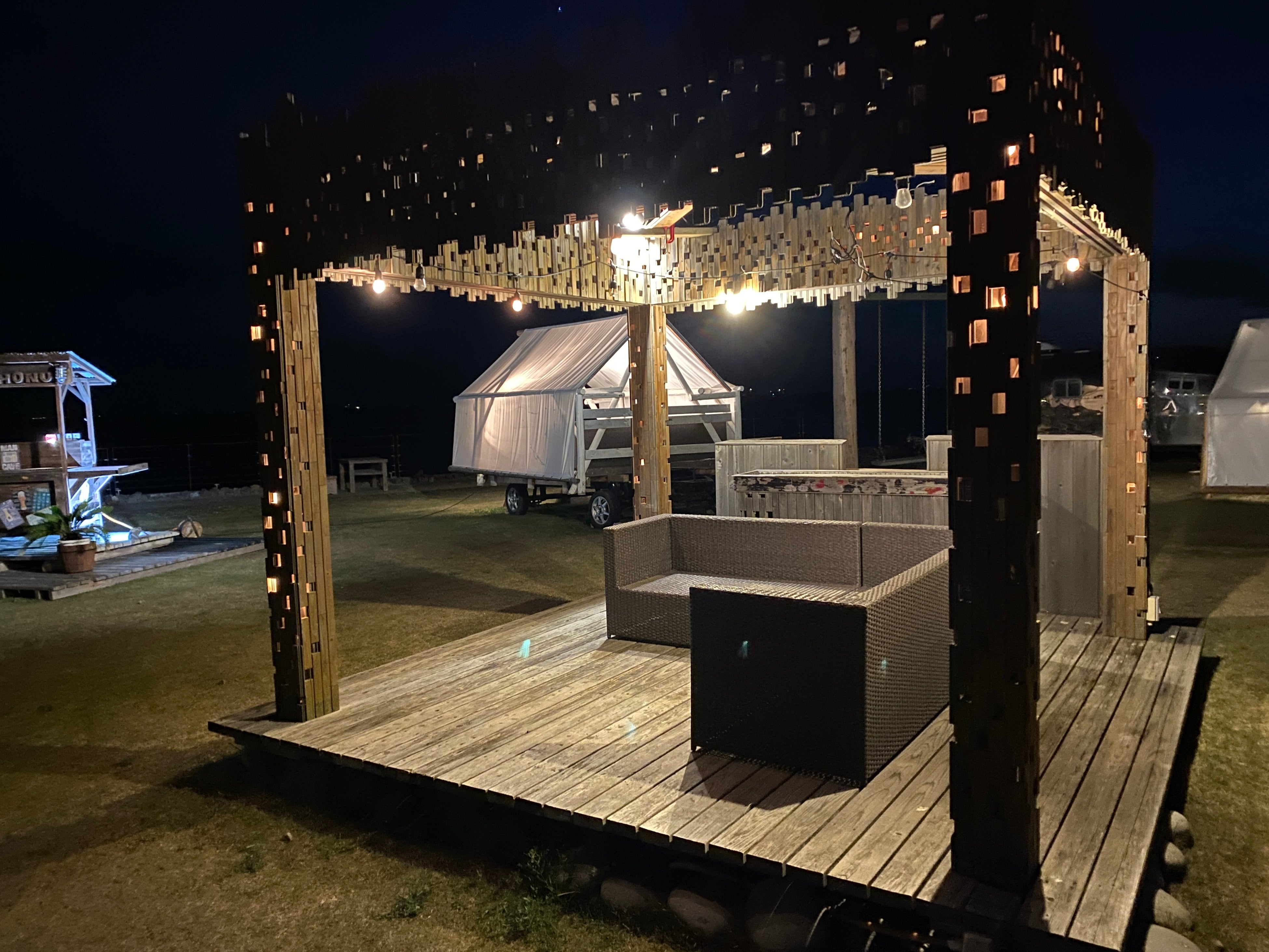 夕暮れ時、海辺のwood design park Nomaが、不思議な魅力に満ちた空間に包まれる。