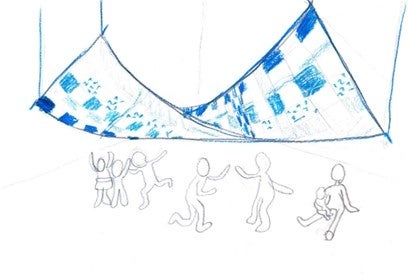 S BRICK内(キッズベース)を布で彩られた作品が「いつもと違う」空間を演出。会場壁面のレンガも模様と捉え、Sally Hancoxが染めた藍のグラデーションのタペストリーと障子枠を活用した一帯作品を展示します。さらに、展示が終わったあとも、子どもたちがさまざまに変化させ、遊びを創造してほしいと考えています。
