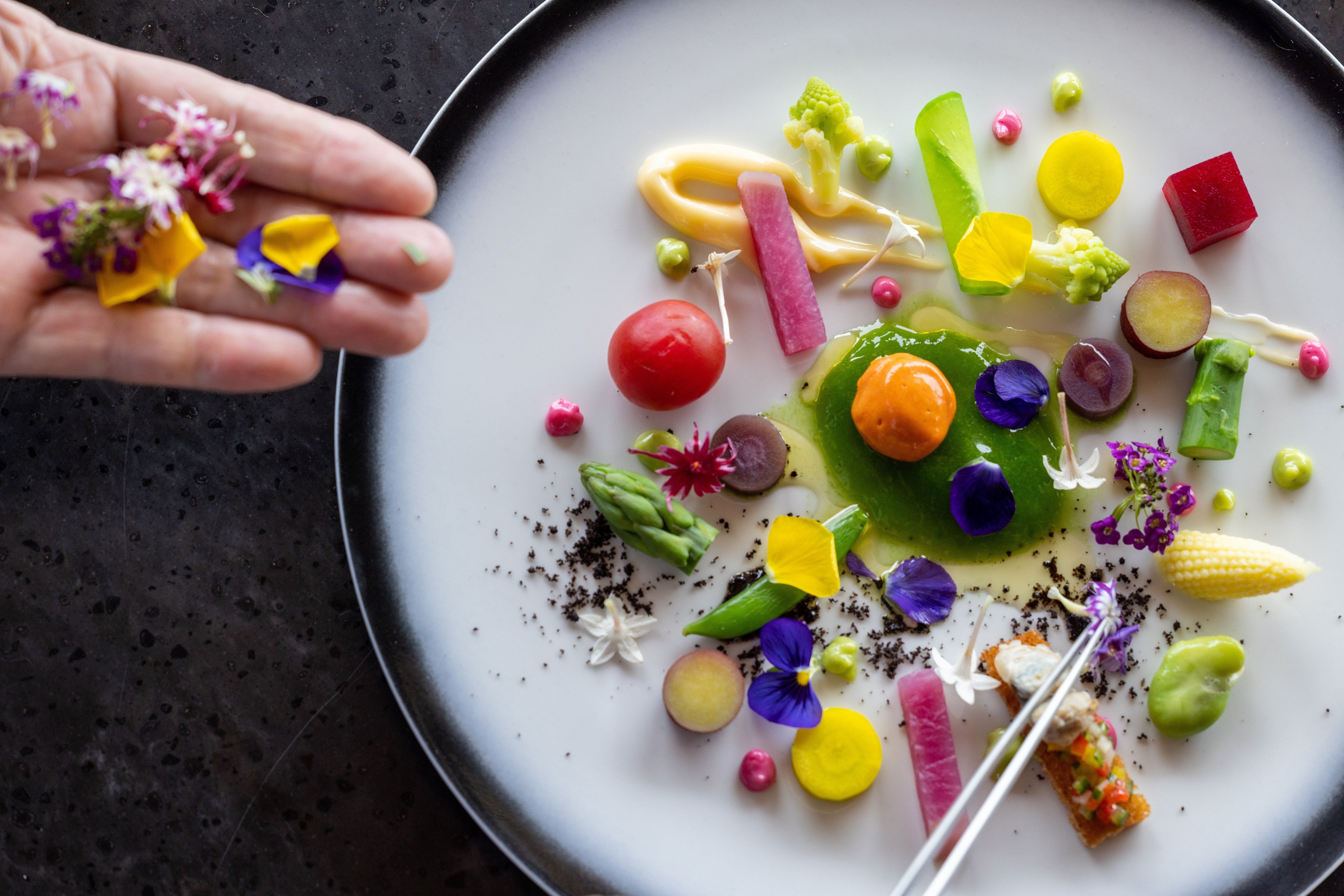 出雲近郊でとれたお野菜を様々な調理法で一皿にちりばめた宿泊者限定でご提供するディナーコースのシグネチャープレート。緑黄色野菜のピューレの上にはパプリカのムースをうかべ、日本海に沈む夕日をイメージしています。お野菜の他にはしじみのブルスケッタ、ビーツの赤いムース、葱のピューレなどを飾りお好みで混ぜてお召しいただきます。