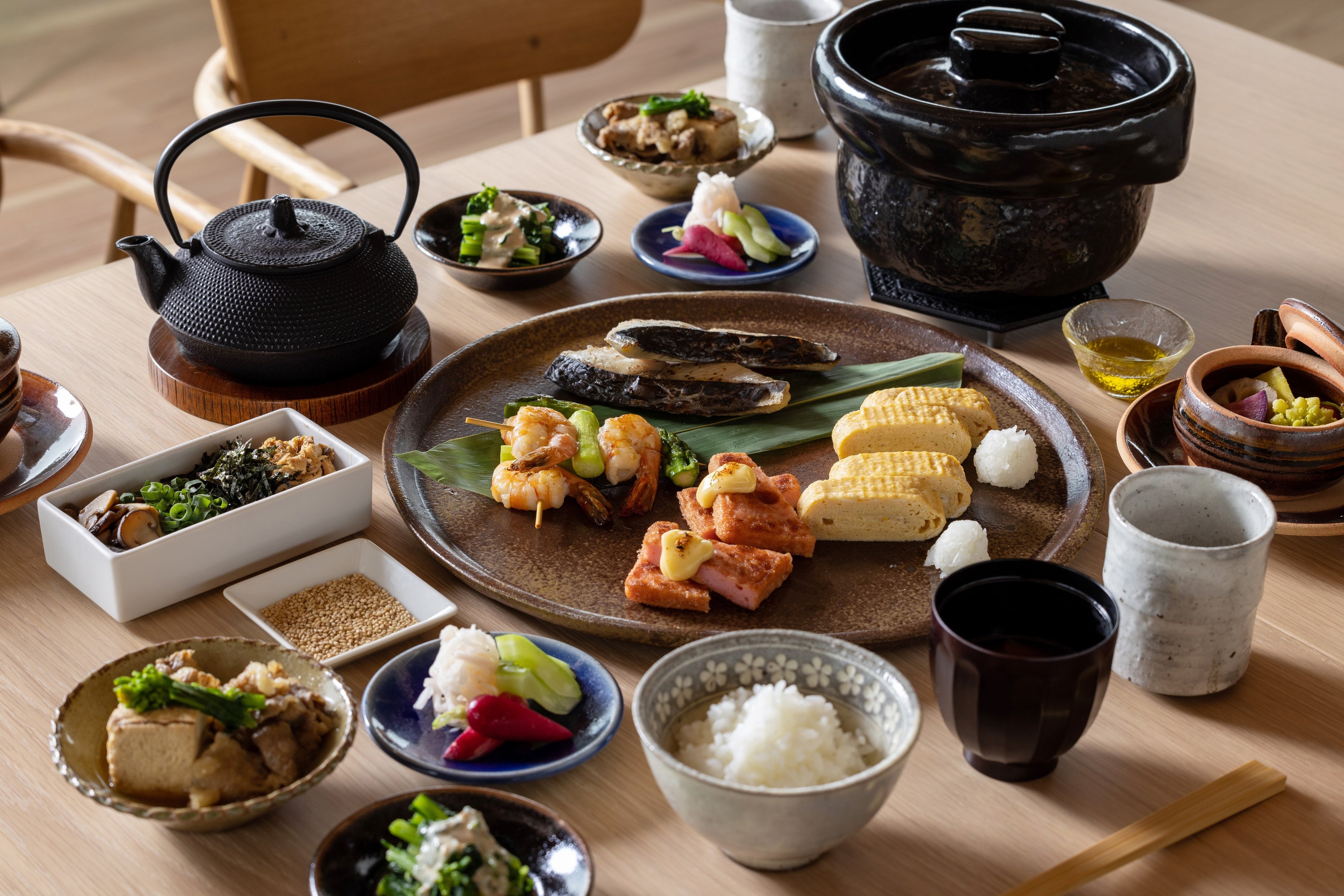 「目覚めのしじみエスプレッソ」からはじまり、ネッカ卵の出し巻き卵、鰆の西京焼き、しまね和牛の肉豆腐などが並びます。ふっくらつややかな土鍋ごはんは島根県のブランド米・仁多米を使用し、朝食の時間に合わせて炊き立てをご提供します。味変には大名茶人として名高い松平不昧公が好んで食べたという汁かけご飯を元に郷土料理として広まった鯛めしをご用意しています。
