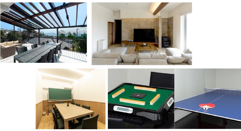 卓球、自動麻雀卓、Playstation5、コントローラー4台、BBQグリル(LPガス方式)、LOOSER(冷蔵庫付き多機能テーブル/Qi充電/Bluetoothスピーカー)、Bluetoothスピーカー、テレビ、デュアルサブウーファー搭載サウンドバー、カラオケ*、高速無料Wi-Fi、モニタ(HDMIケーブル)、洗濯機、洗濯干し、ドライヤー、空気清浄機、掃除機、ハンガー、延長コード