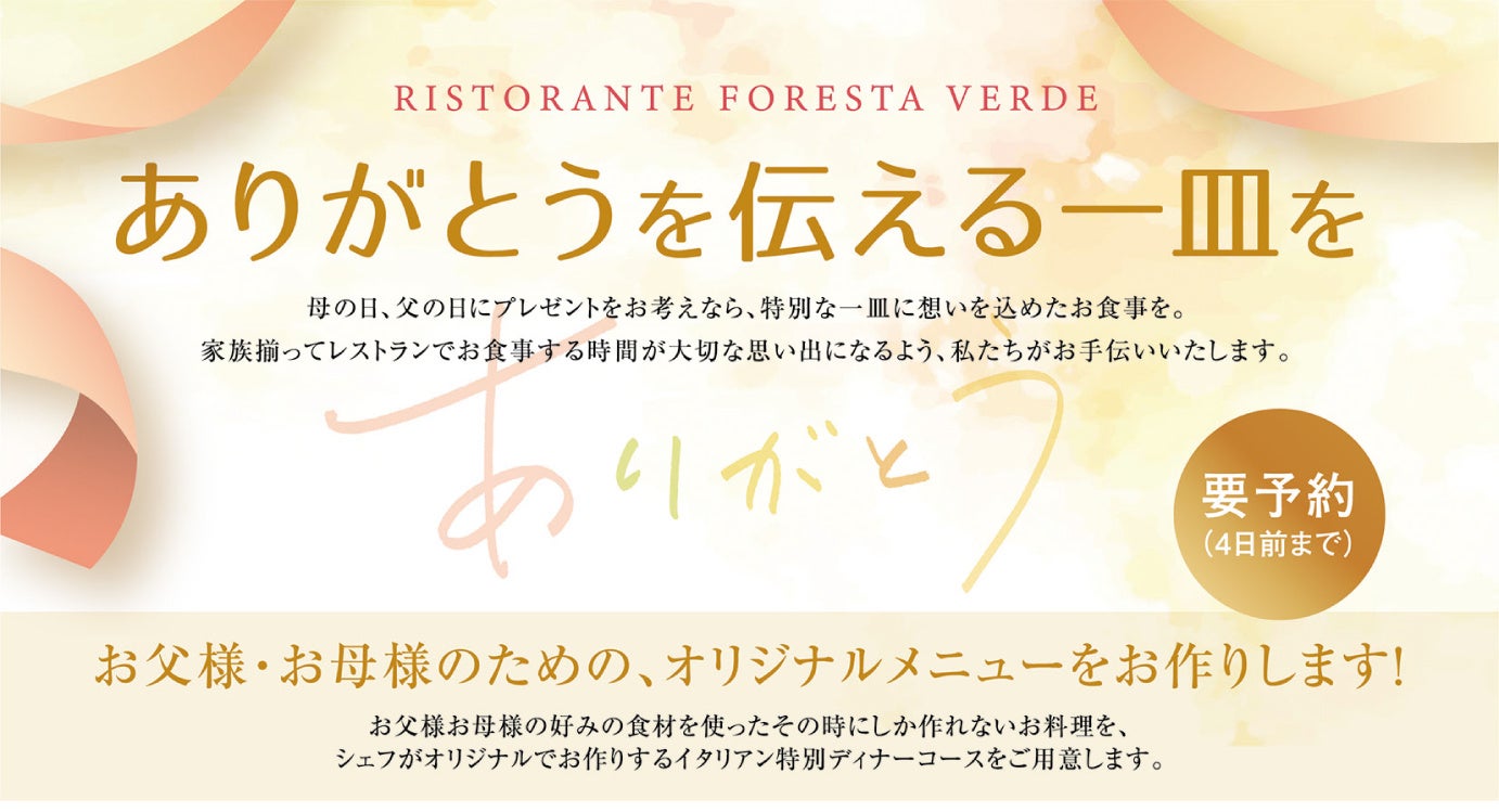 株式会社あいプラン(北海道札幌市/代表取締役・新道喜信)のリストランテ フォレスタ・ヴェルデ(北海道旭川市高砂台1丁目2-1)では母の日・父の日イベントとして、5/1~6/30の期間で特別なディナーをご提供いたします。シェフオリジナルの特別ディナーは、お母さん、お父さんのお好きな食材を使って作るスペシャルコース。ご家族で、おふたりで、日頃の感謝が伝わる特別なお食事に是非ご利用ください。