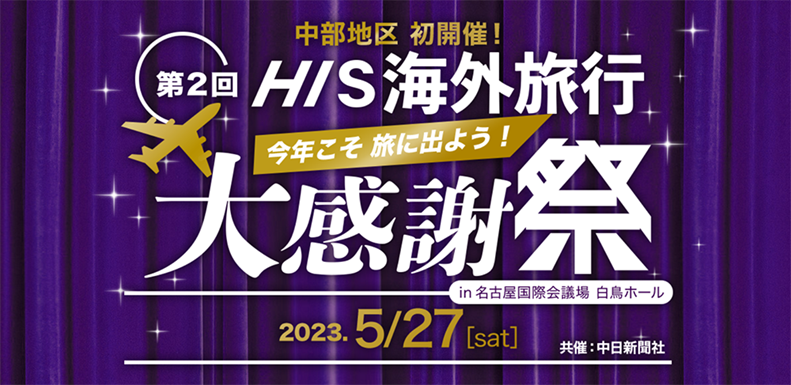 楽しみながら旅先の魅力を再発見する「HIS海外旅行大感謝祭」は、今年2月に第1回目を東京プリンスホテルにて開催し、2日間で延べ1万人以上の方にご参加いただく盛況ぶりでした。かねてより地方での開催希望のお声も多くいただき、このたび愛知県名古屋市にて開催することにいたしました。政府観光局、航空会社による最新情報やブースでのクイズ大会、ゲーム、世界の名物料理など、旅のワクワクを体感いただけるイベントとなっております。